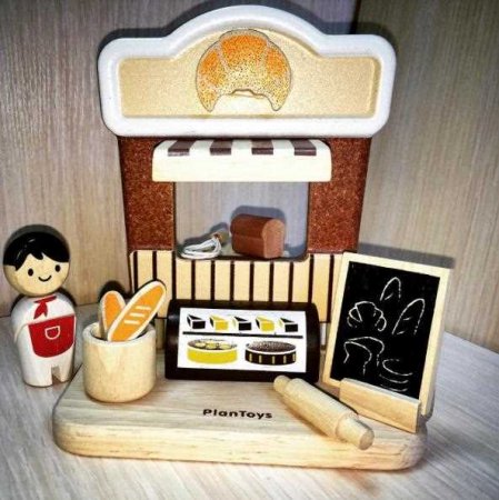 Lite bakeri ffra PlanToys med tilbehørSkjønn dobbeltsidet lekebutikk med ekspeditør, brødutstilling, bord og hyller, bakeredskaper, vareskilt og forskjellige slags brød. En butikk klar til å motta morgenfriske kunder.