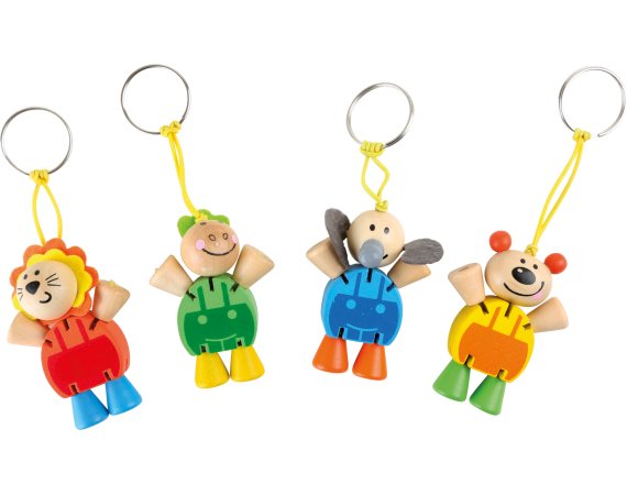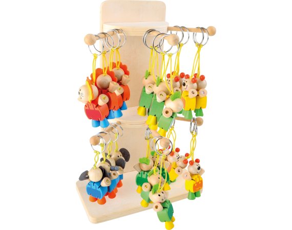 Trestativ med 24 fine nøkkelringer med forskjellige dyrNøkkelringfigurene har bånd av strikk og kan bevege sine hender og føtter.