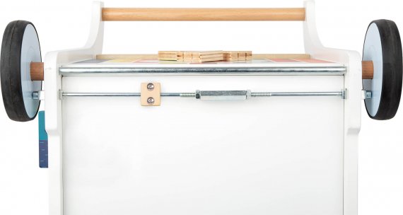 Gåvognen har putteboks-funksjon, elefant, trer og skyer som kan skyves rundt, og en regnbue som kan veltes og reise seg igjen. Lær å tælle eller skrive på kritt-tavlen.