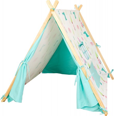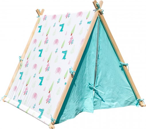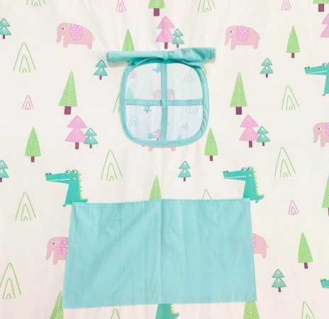 Teltets tekstil er fylt med krokodiller, elefanter og trer og ser ordentlig trendy ut. Teltets åpning er i ensfarget tekstil. Teltduken har bånd som festes til de medfølgende teltstengene i tre. Inngangen og vinduene lukkes også med bånd.