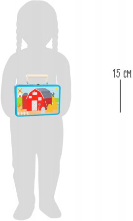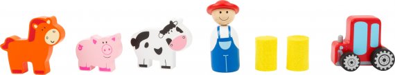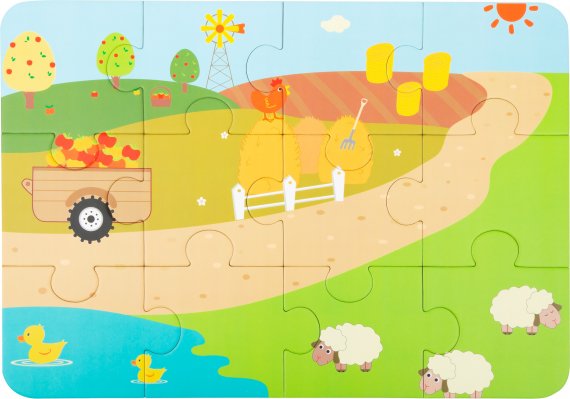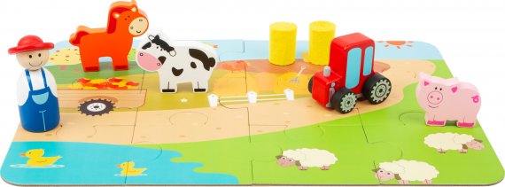 Grisen grynter og traktoren brummerTemalekesett med landskap, som skal samles som et puslespill. Settet inneholder også en traktor, husdyr, høyballer og en trebonde.
