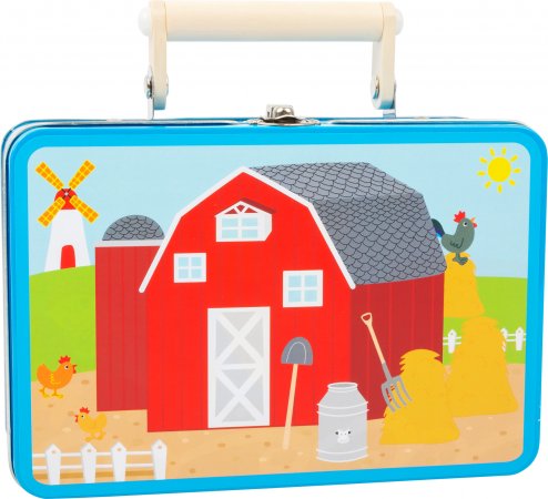 Flott og kompakt lekeverden i praktisk metallkoffert med håndtak i tre, som er enkel å åpne og lukke.