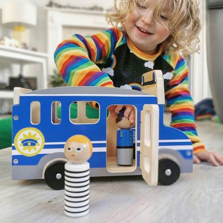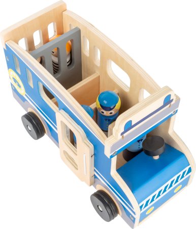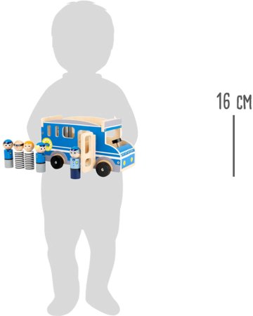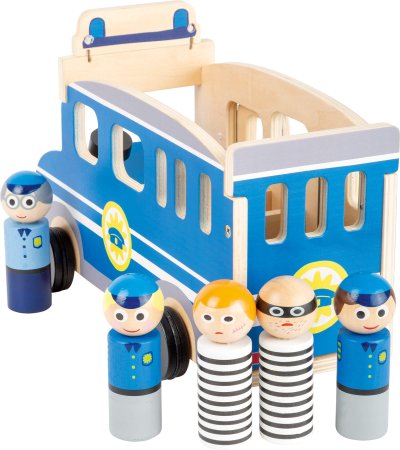 Hallo, hallo - det her er politiet!Stor politibuss med plass til røvere. Bussen har gummidekk, en dør med hengsel, og en kasjott bakerst på bussen.