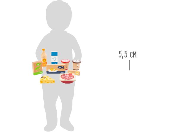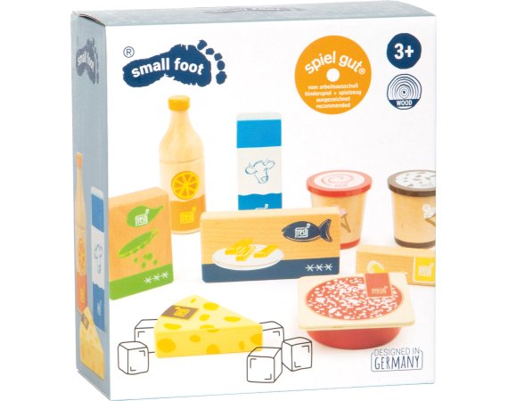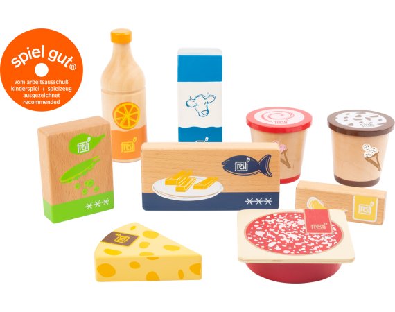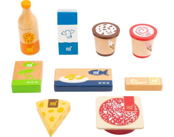 Settet består av en flaske appelsinjus, to bokser med is, en pakke erter, fiskepinner, smør, ost, salami, og et kartong melk - til sammen ni deler.