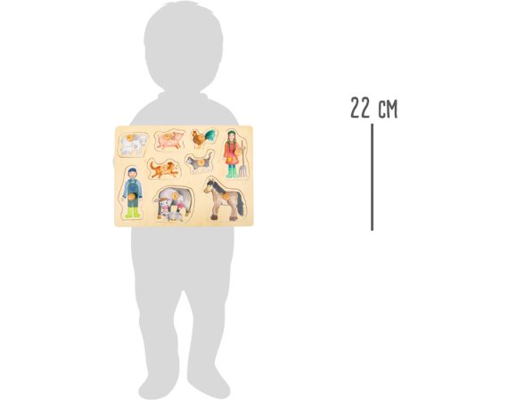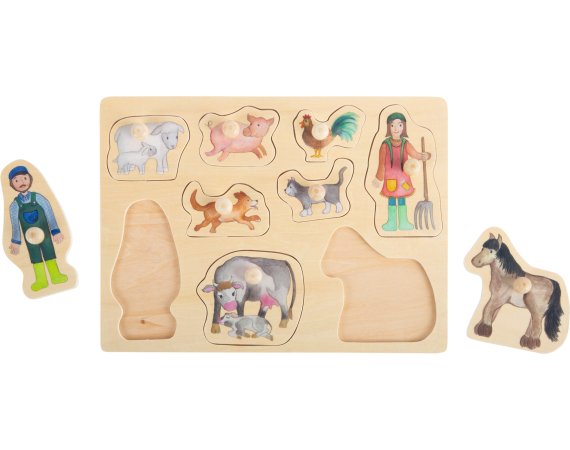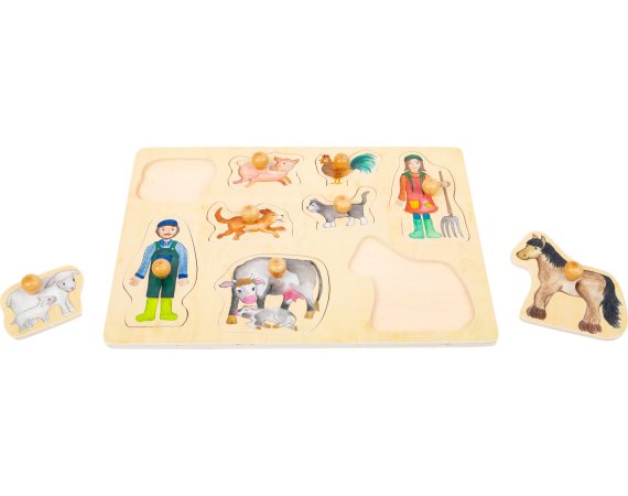 Puslespill for de minste med dyr og mennesker fra bondegårdenPuslebrikkene har treknotter, som gjør det enkelt for barnet å gripe fast i brikkene.