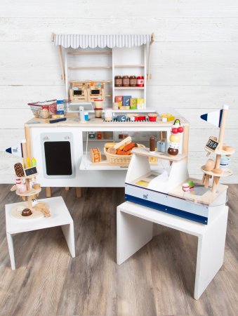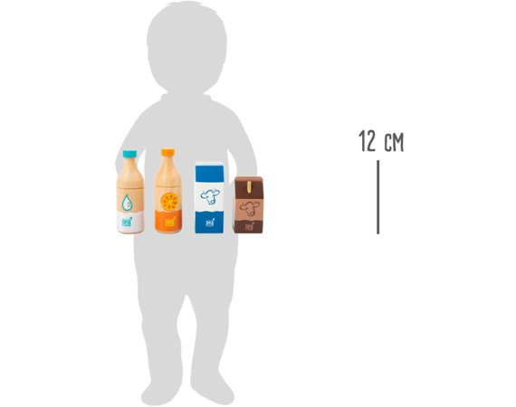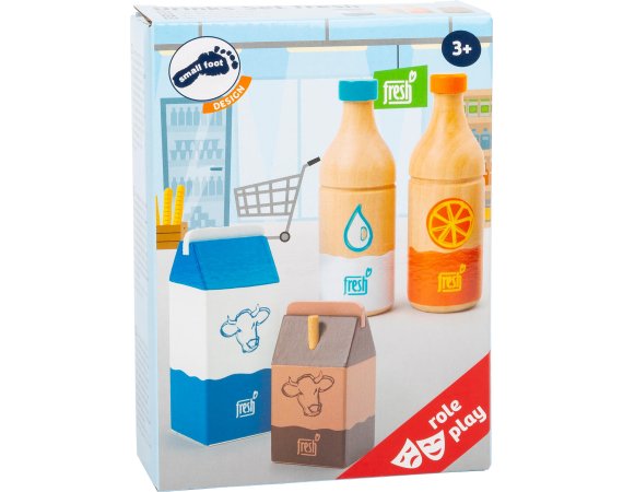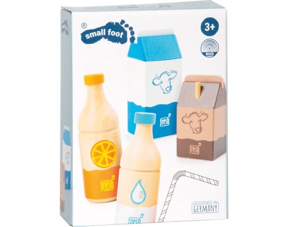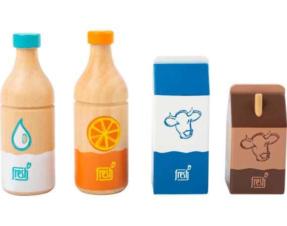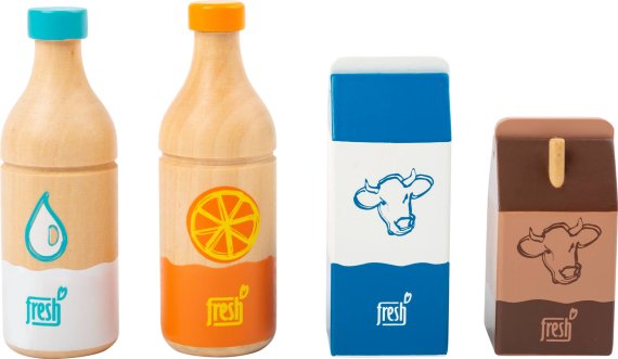 Fine drikkeflasker og kartonger i tre, til bruk på barnekjøkkenet eller matbutikken.