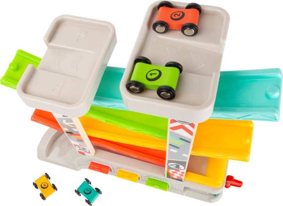 Settet inneholder to parkeringsdekk, hvorfra to racerbiler kan startes samtidig. Hvem er raskest og vinner løpet!