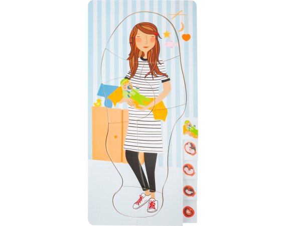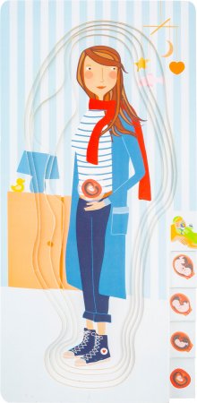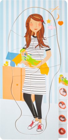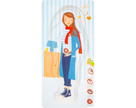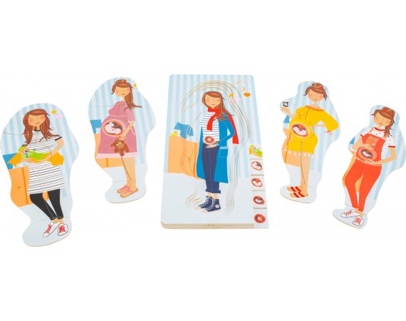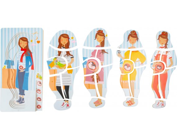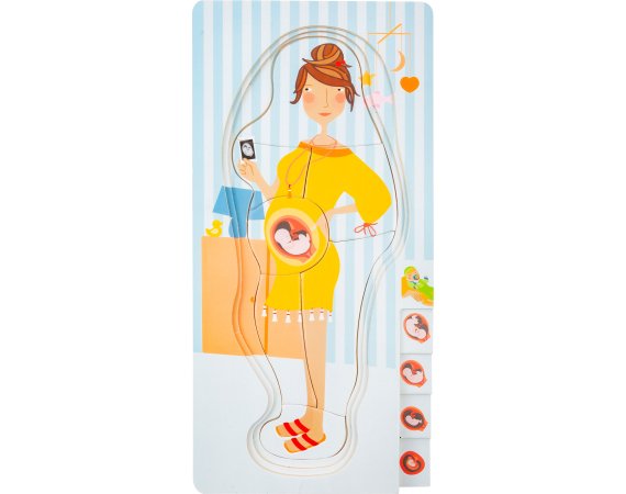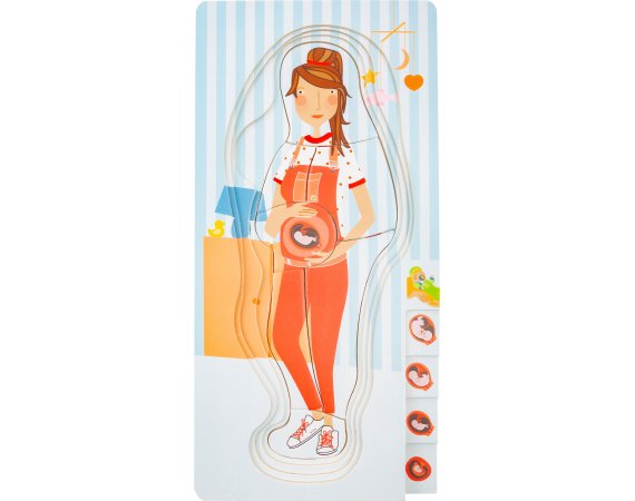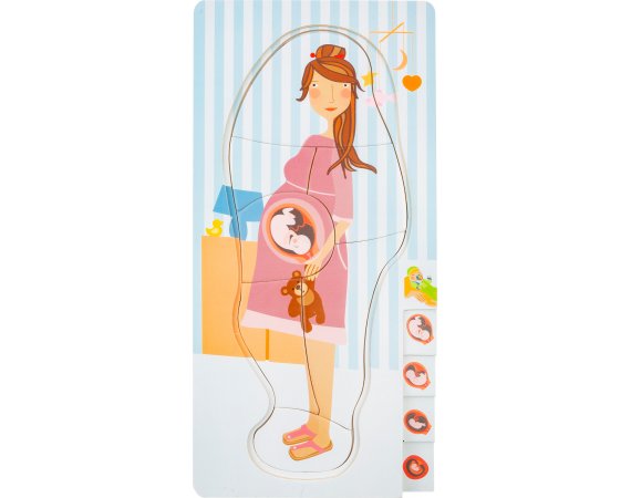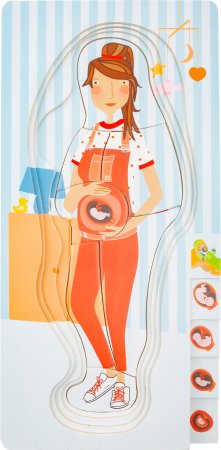 Med dette lagdelte puslespillet som består av totalt fire lag, kan barn bli undervist i graviditetsprosessen på en veldig leken måte.De forskjellige lagene i det lagdelte puslespillet er illustrert med bilder av den voksende babyen i magen.