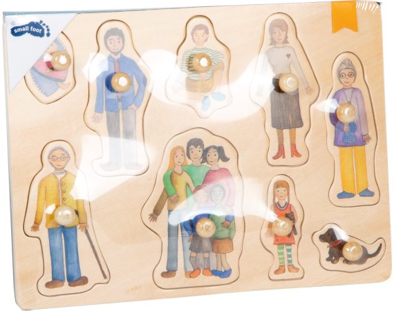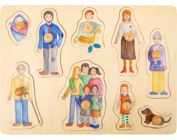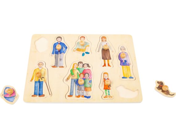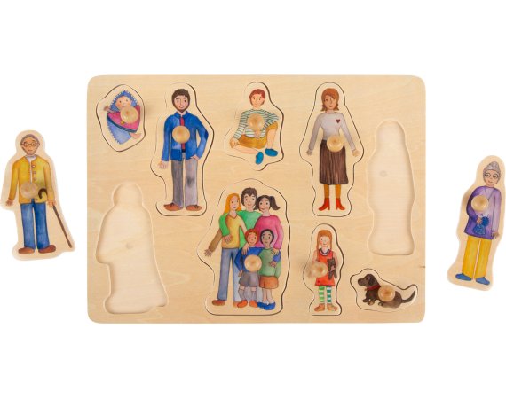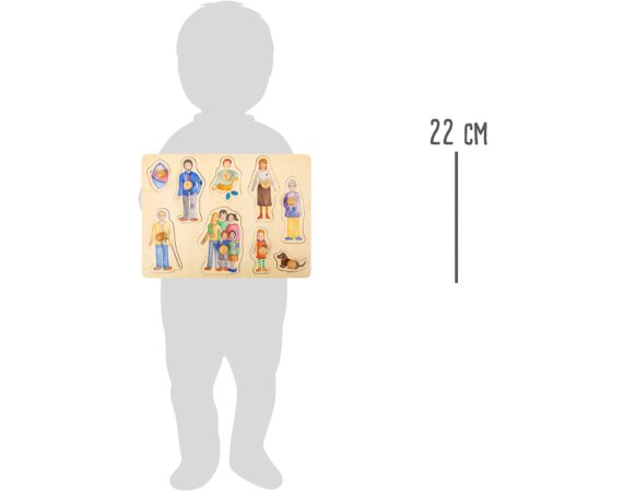 Puslespill med mennesker i ulike situasjonerPuslebrikkene har treknotter, som gjør det enkelt for barnet å gripe fast i brikkene.