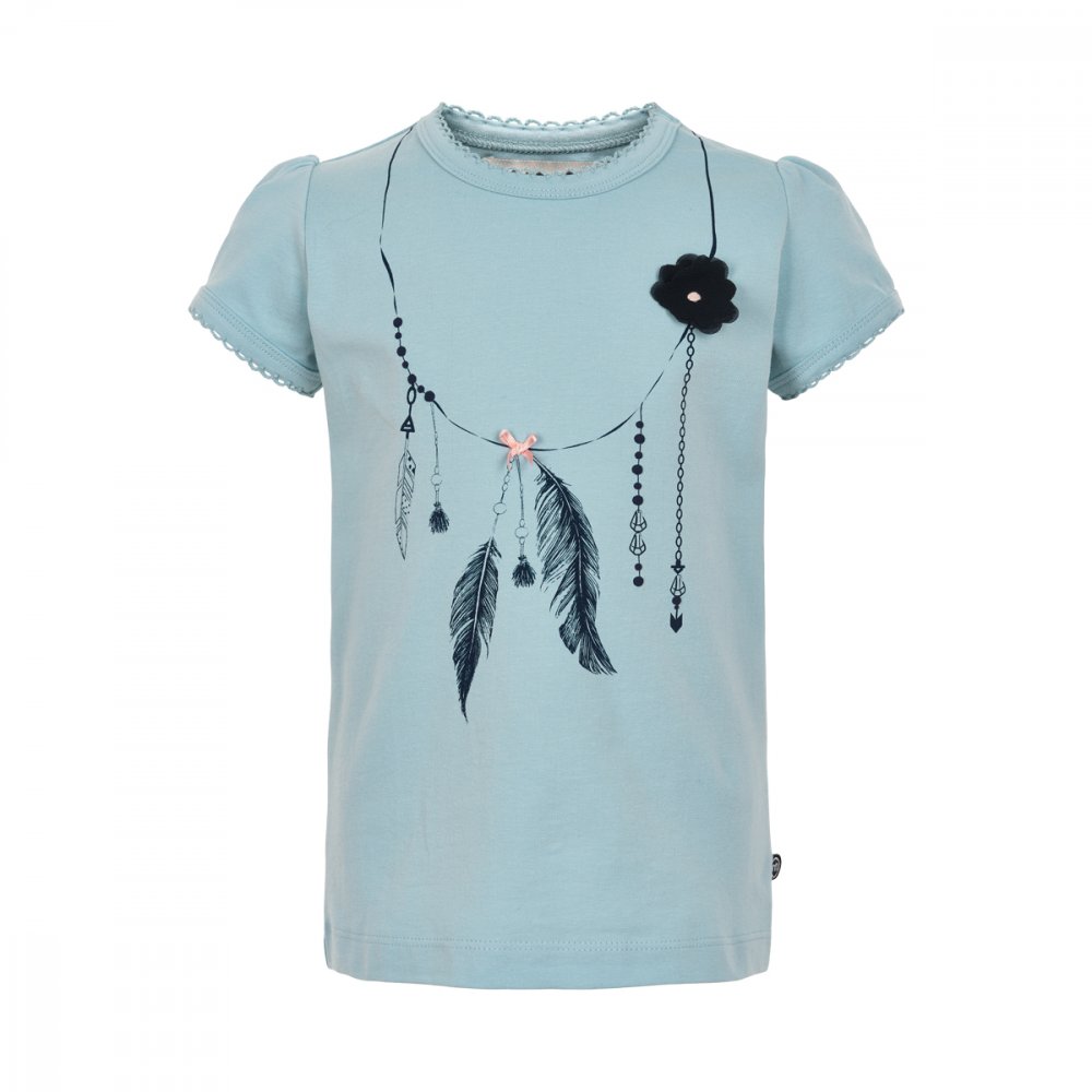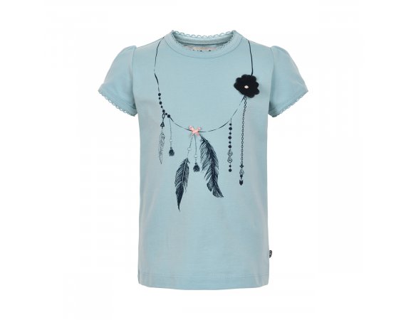 Flott kortermet blå T-skjorte med yndig trykt smykke og en påsydd blomst