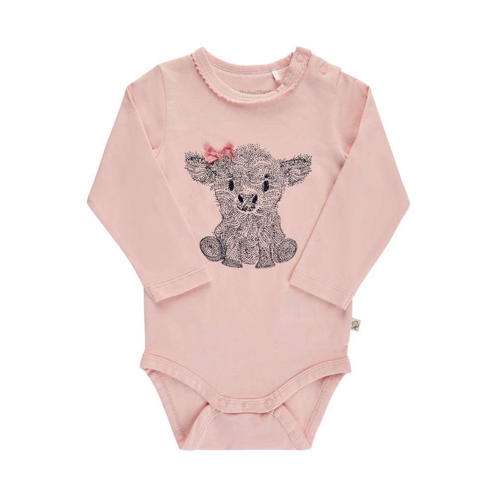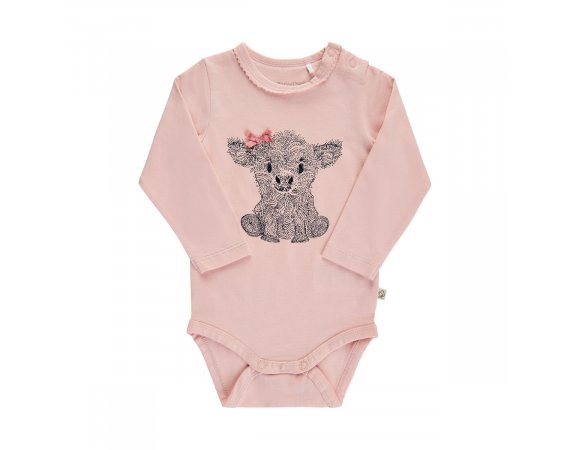 Søt gul body med lange ermer og fint trykk av en bøffel med sløyfe