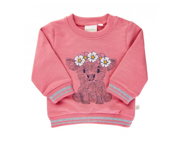 Fantastisk flott rosa sweatshirt med fint trykk av en ku pyntet med blomstergenseren har flott ribbestrikk med sølvfargede striper ved ermene og i livet.