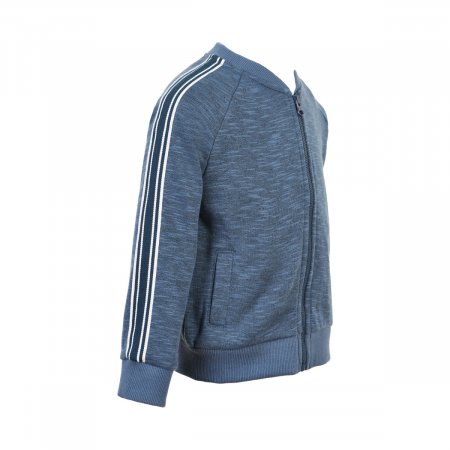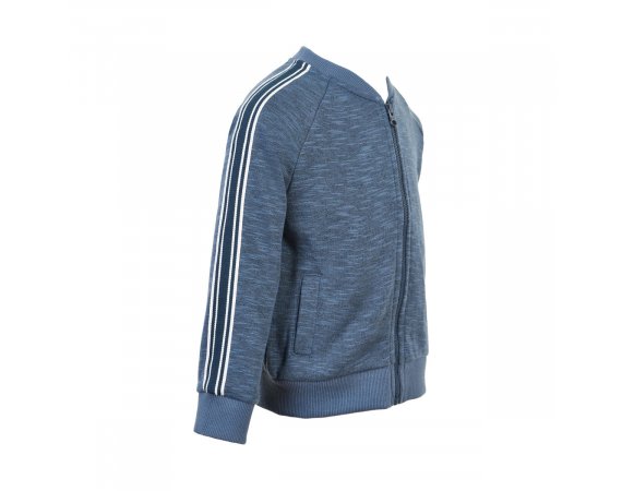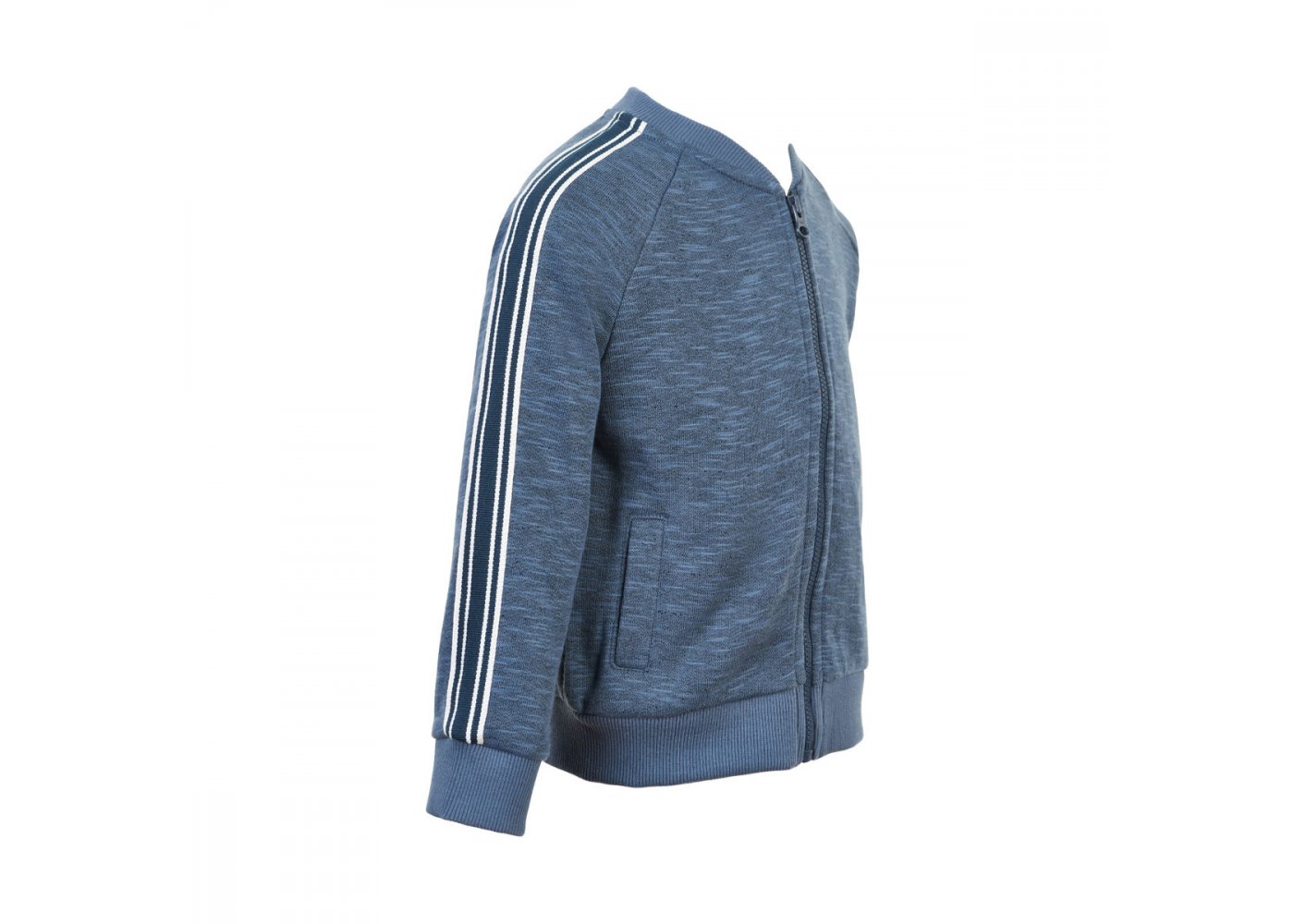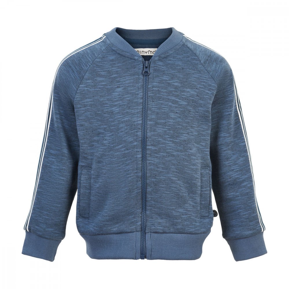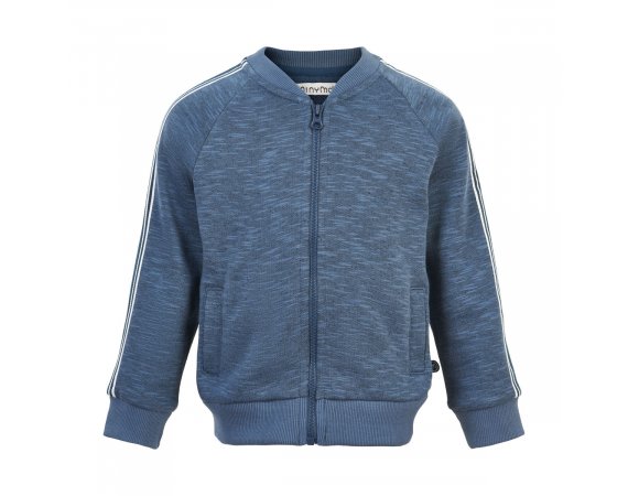 Trøyen har glidelås, to lommer foran, og brede ribbestrikkede kanter langs alle åpninger.