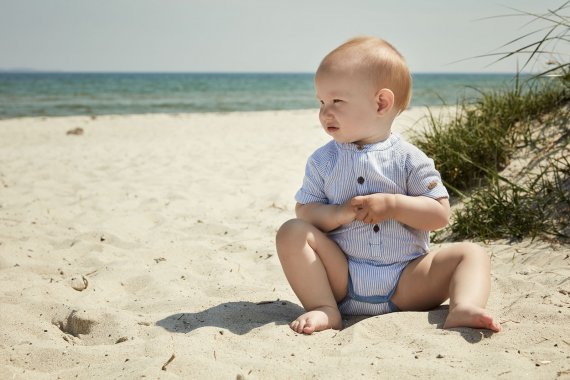 Søt skjortebody med et stilig utseende til en varm sommerdagSkjortebody med tynne blå og hvite striper og flott kinakrage.