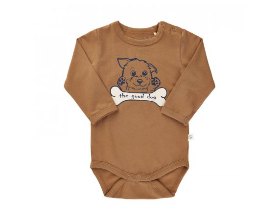 Fin body med lange ermer og morsomt trykk av en hund med kjøttben.Bodyen har faste ribbestrikkede kanter langs alle åpninger, og lukkes med trykknapper på venstre skulder og mellom benene.