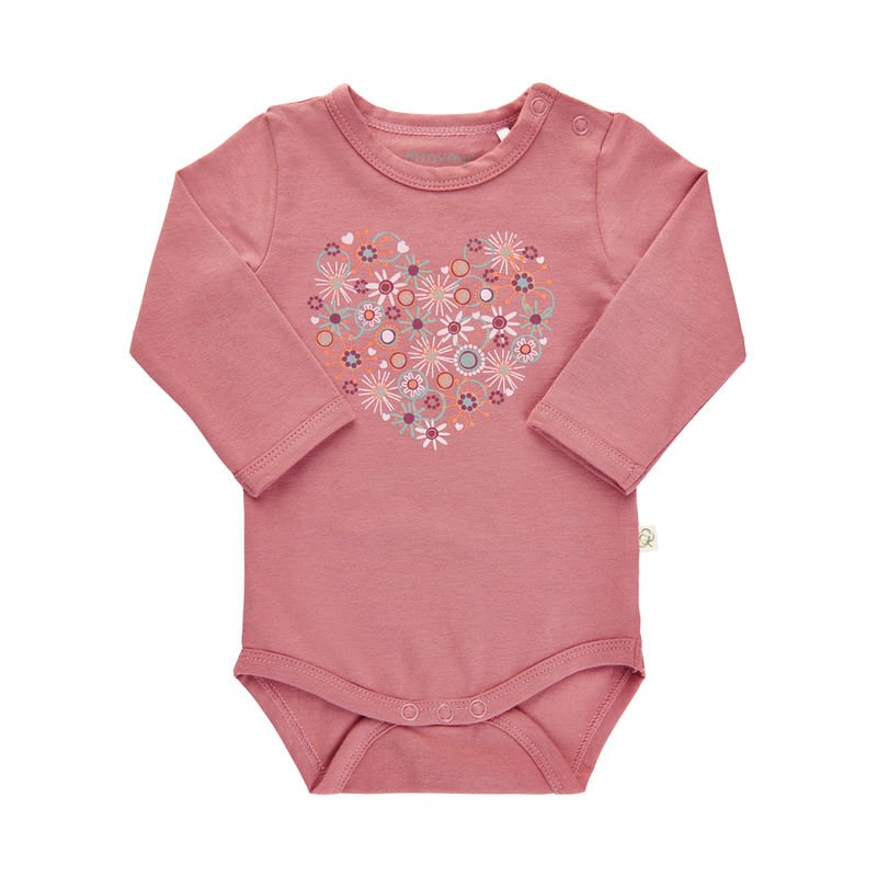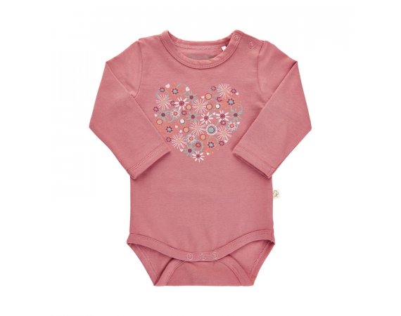 Fin body med lange ermer og søtt hjerteformet trykk.Bodyen har faste ribbestrikkede kanter langs alle åpninger, og lukkes med trykknapper på venstre skulder og mellom benene.