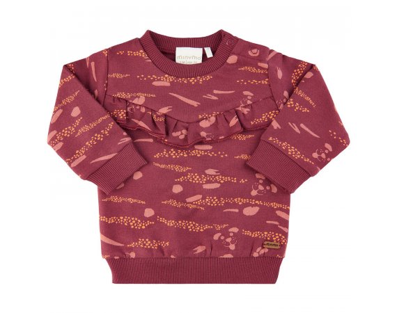 Trøyen har en volang bortover brystet, ribbestrikket kant langs alle åpninger, og lukkes med trykknapper på venstre skulder.