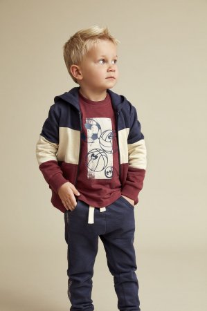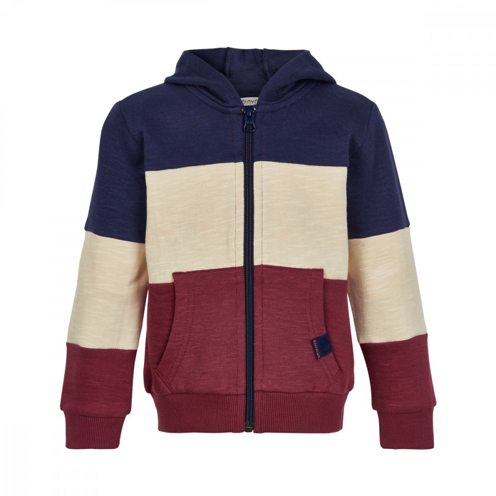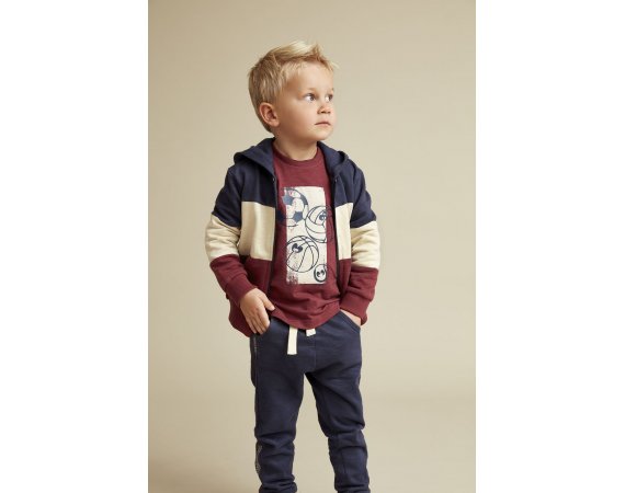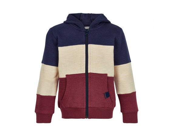 Den har bred ribbestrikket kant langs bunnen og ved håndleddene.