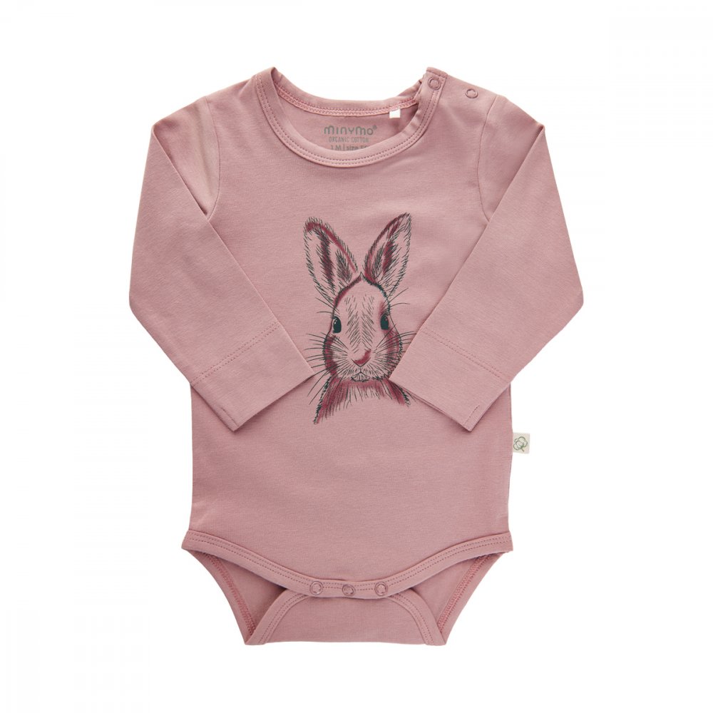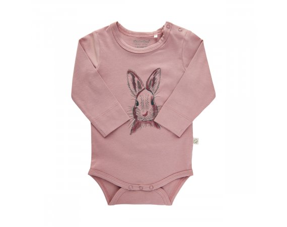Fin body med søtt kanintrykk på brystet.Bodyen har lange ermer, smalt ribbestrikket kantebånd ved halsen og mellom benene, og er laget av herlig jerseystoff.