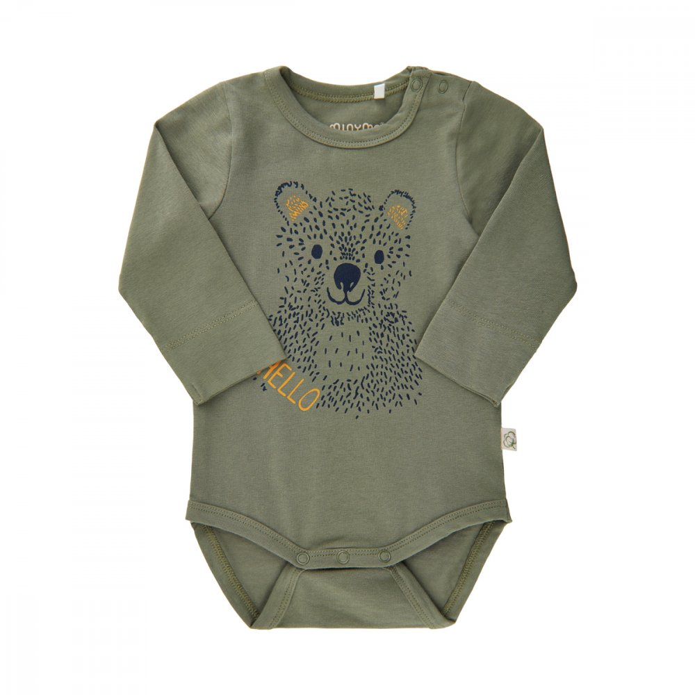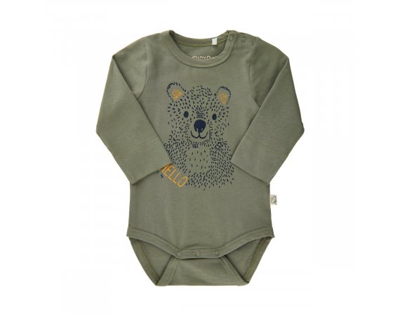 Fin body med søtt bjørnetrykk på brystet.Bodyen har lange ermer, smalt ribbestrikket kantebånd ved halsen og mellom benene, og er laget av herlig jerseystoff.