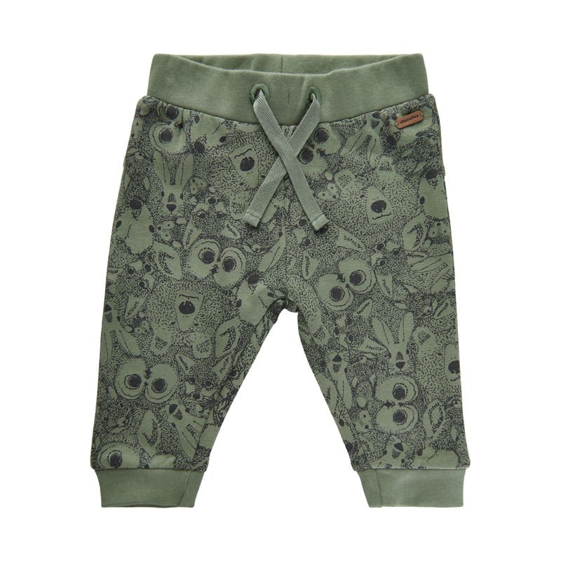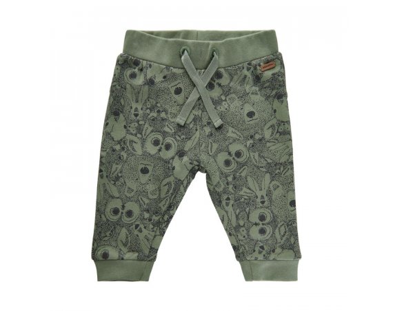 Stilige joggebukser i støvgrønt med dyretrykk.Buksenne har en bred ribbestrikket kant, elastikk og snørebånd i livet, og ribbestrikket kant ved anklene.