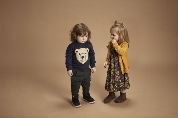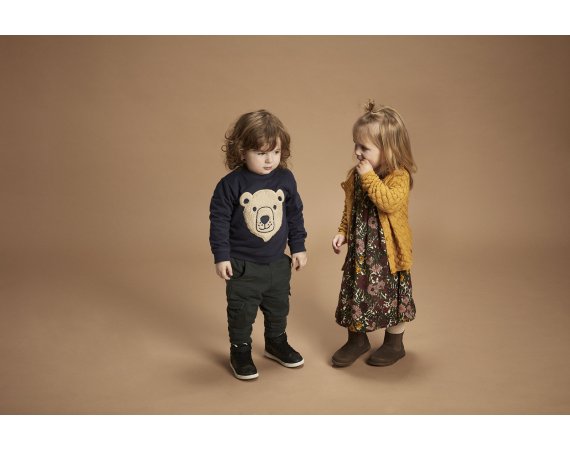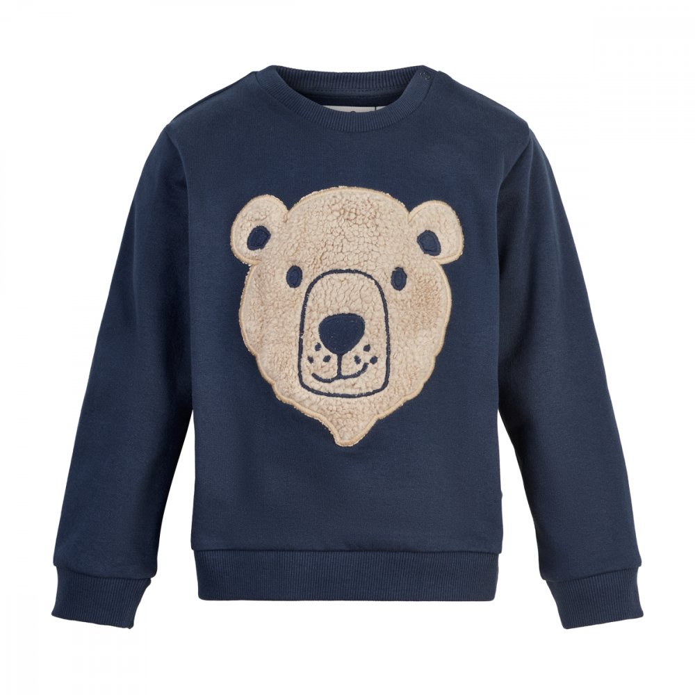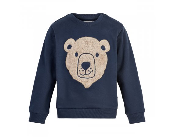 Artig langermet sweatshirt med søtt isbjørnhode i teddystoff på brystet.Genseren har ribbestrikket kant ved halsen, og brede ribbestrikket kant ved håndleddene og langs bunnen. Den er laget av en herlig børstet bomullskvalitet.
