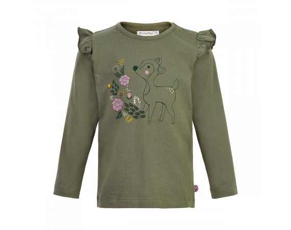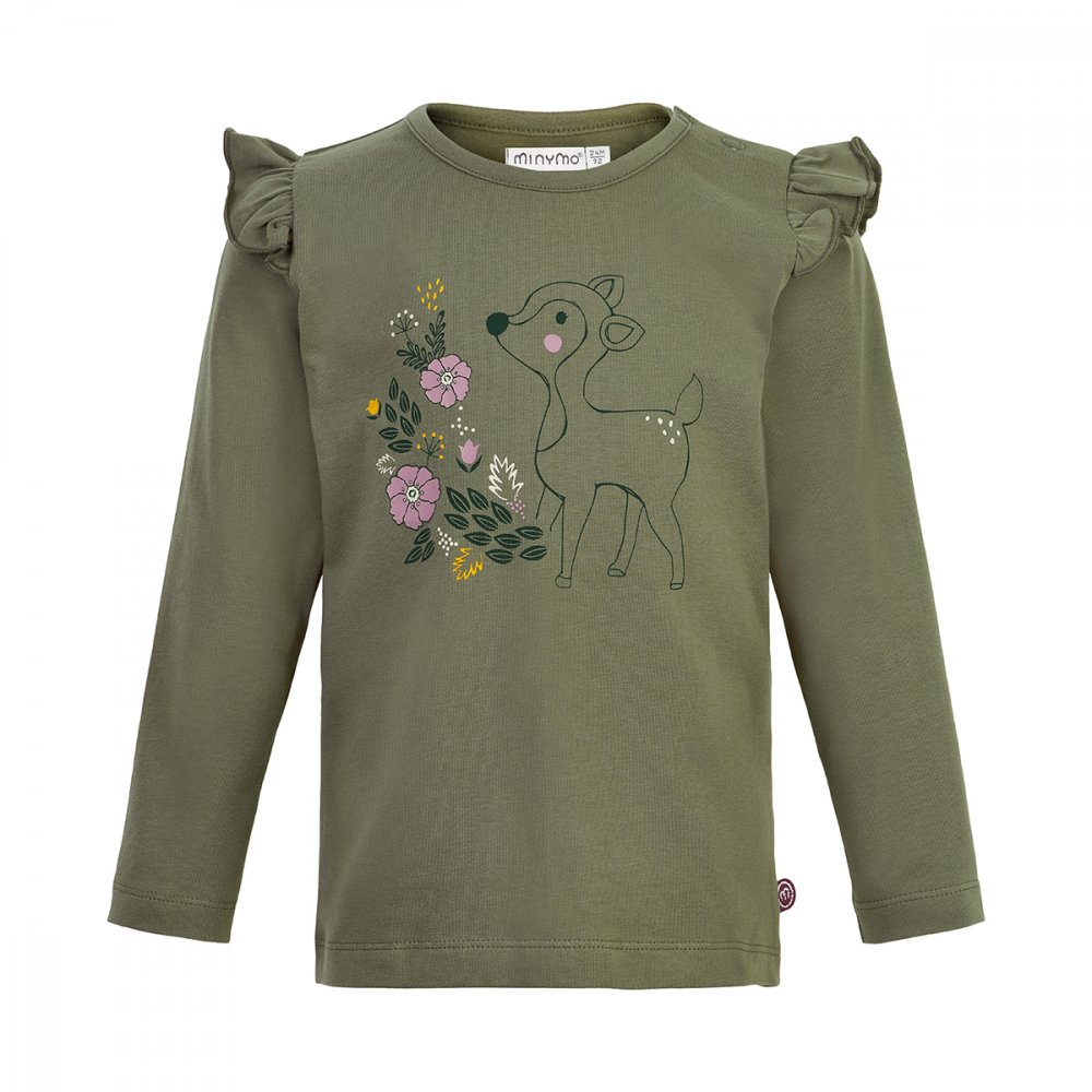 Søt langermet trøye i myk og økologisk bomull fra Minymo.Trøyen har et søtt trykk foran samt fine volanger ved skuldrene, og passer perfekt til både hverdag og fest.