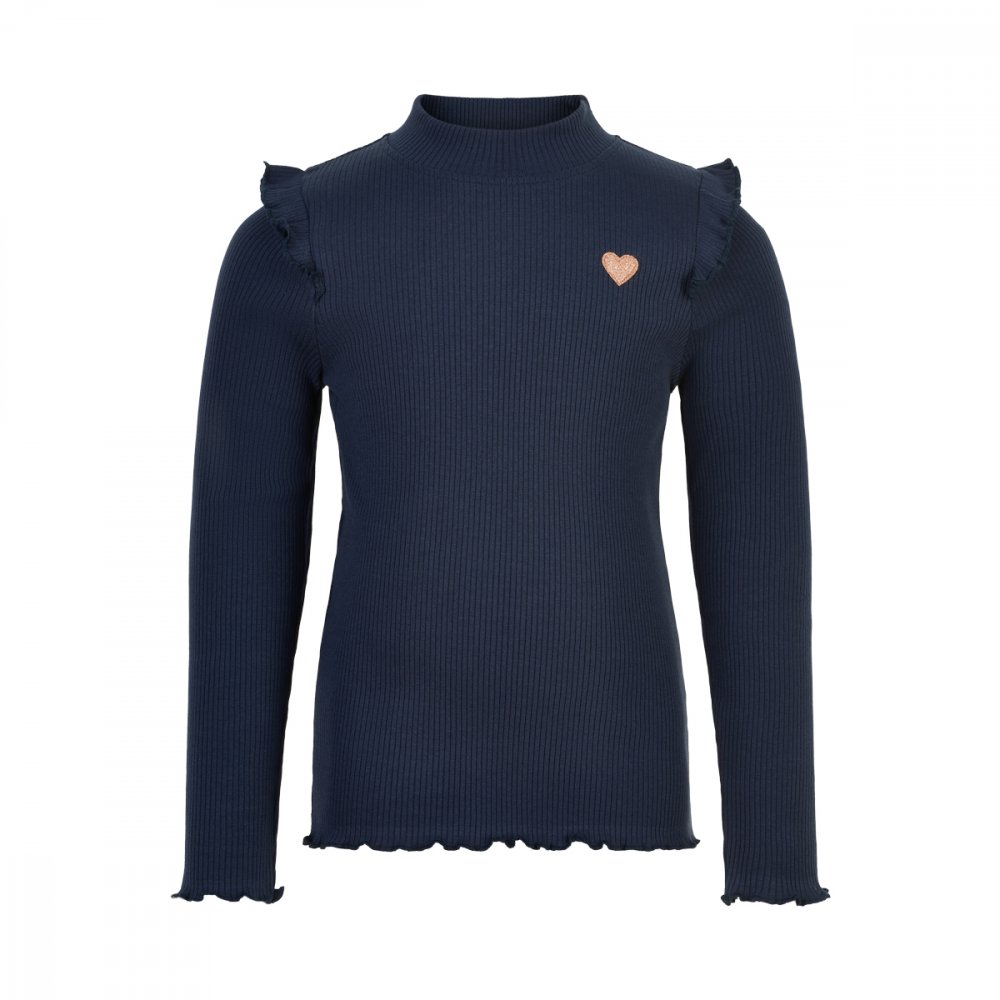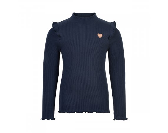 Bluse med feminine flæser på begge skuldre og et sødt glimmer hjerte på brystet. Blusen er i lækker ribkvalitet og har en høj hals.