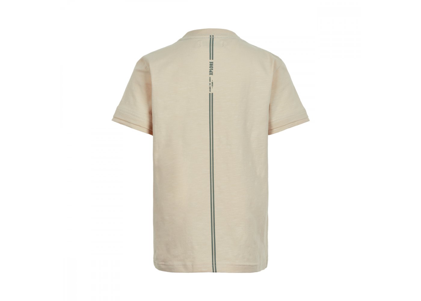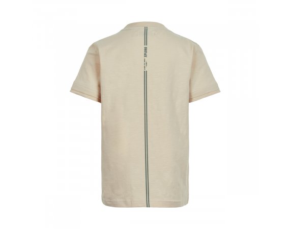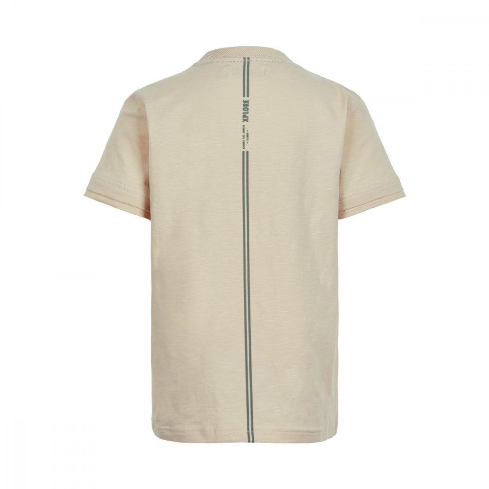 Skøn ensfarvet t-shirt i beige med sejt gekkomotiv på brystet og striber med tekst bagpå.