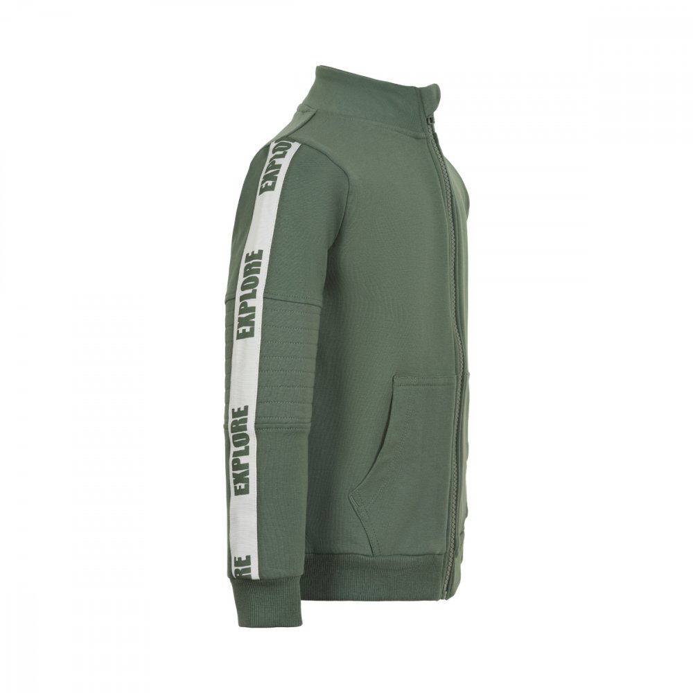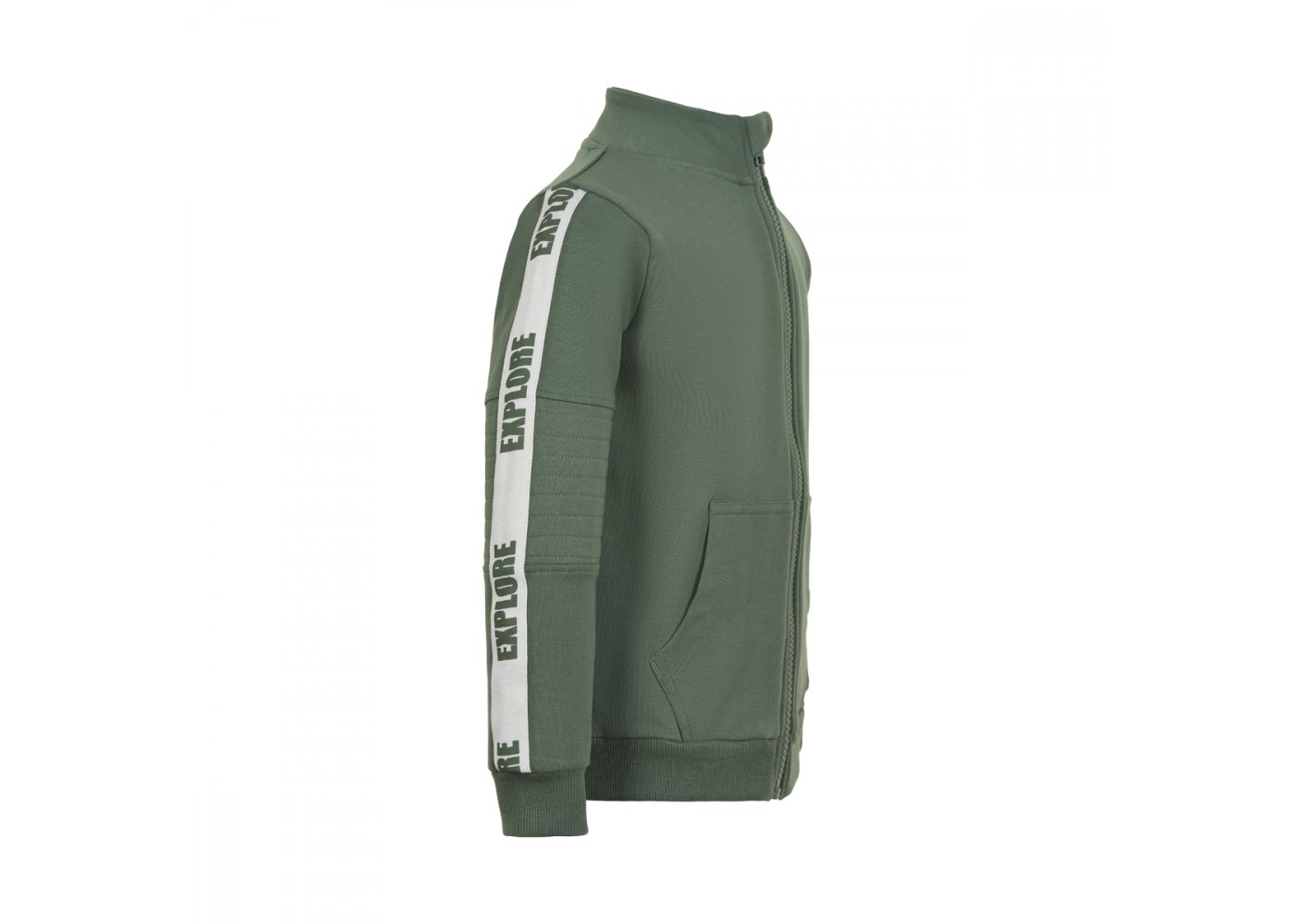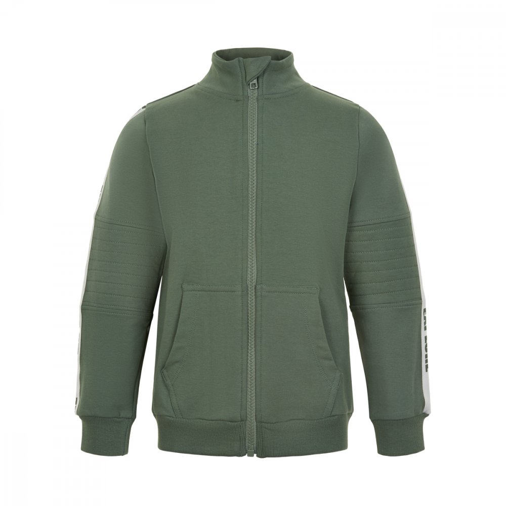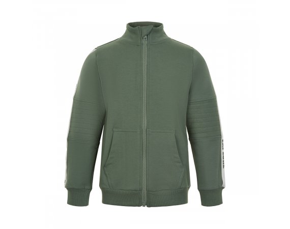 Trøjen har lynlås foran, brede ribkanter i alle åbninger og en lys strib på ærmer med tekst.