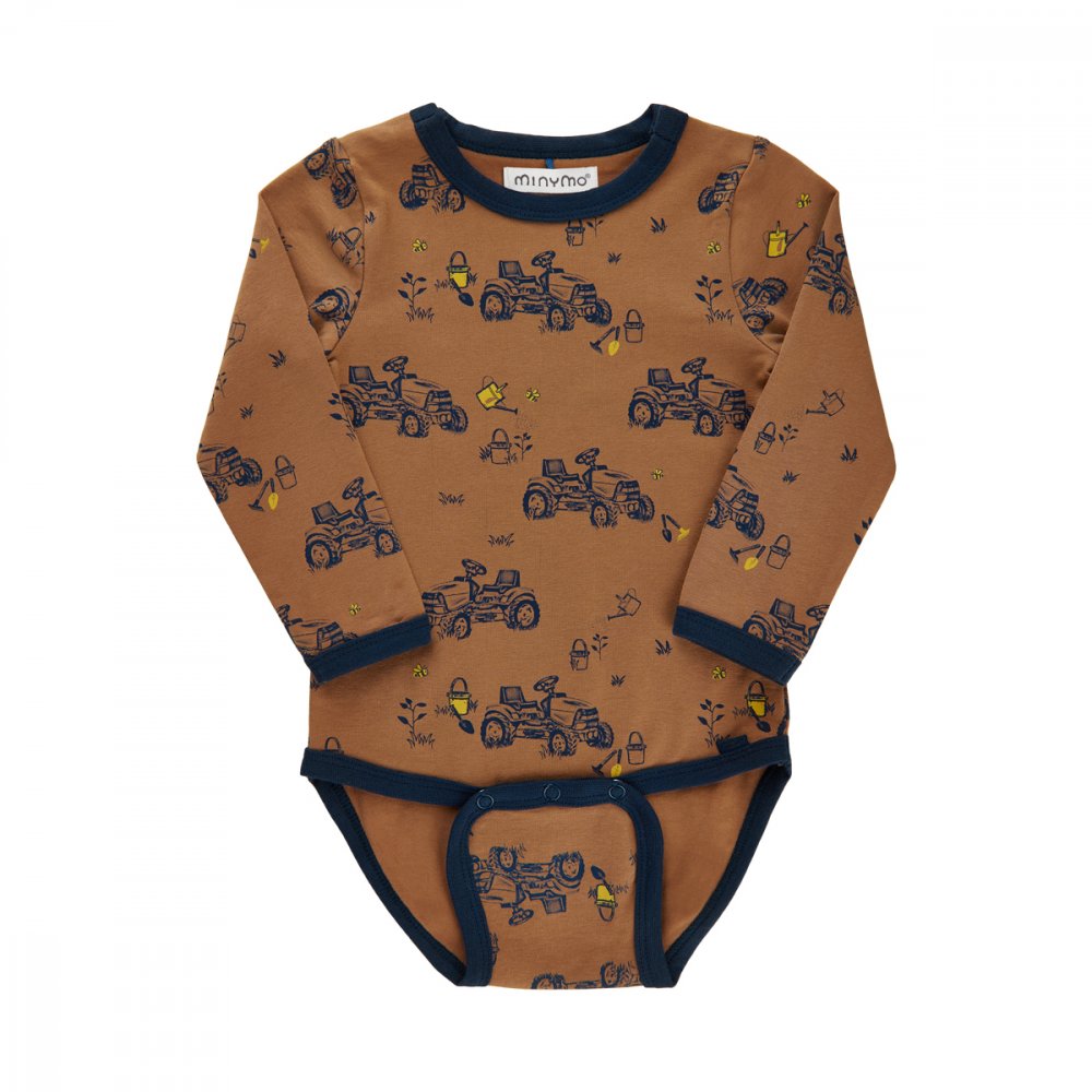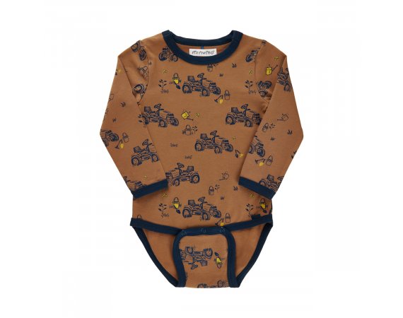 Lækker langærmet body i brun med traktorprint fra Minymo.