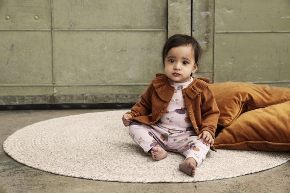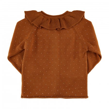 Smuk cardigan i rust brun med fine små prikker.Trøjen har raglanærmer og en flot bred ribstrikket flæsekrave i halsudskæring og lukkes med smukke knapper foran.