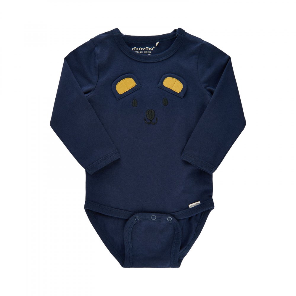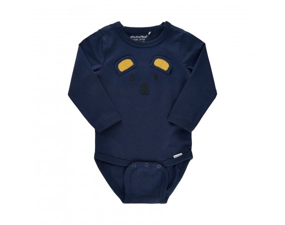 Sjov blå body med bjørnehoved med gule ører fra Minymo.