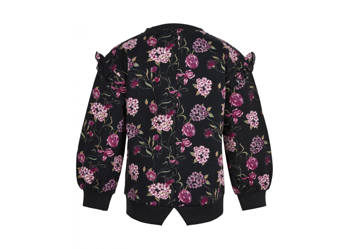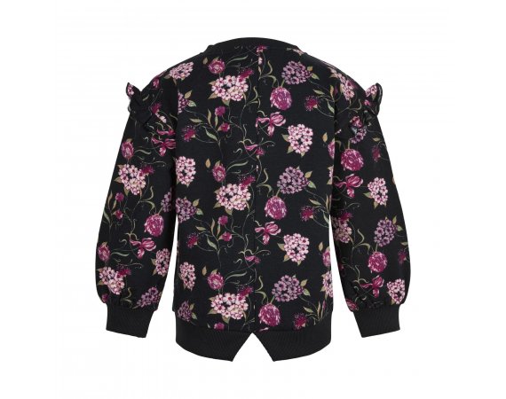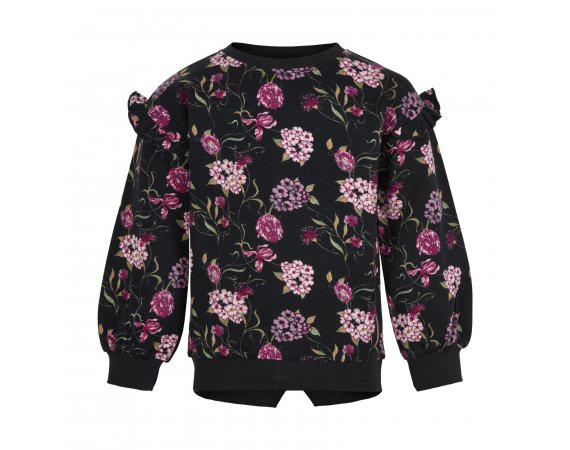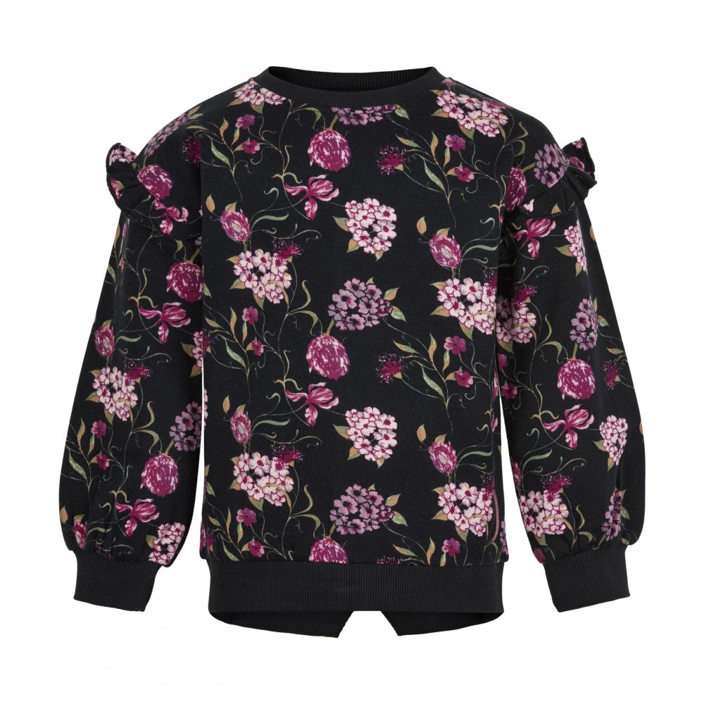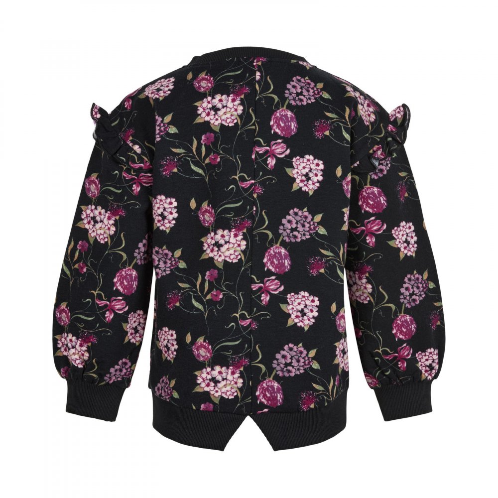 Smart sweatshirt i sort med flotte blomsterranker i rosa nuancer og grønne blade.
