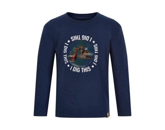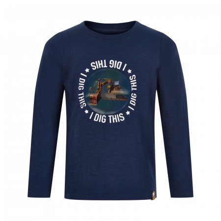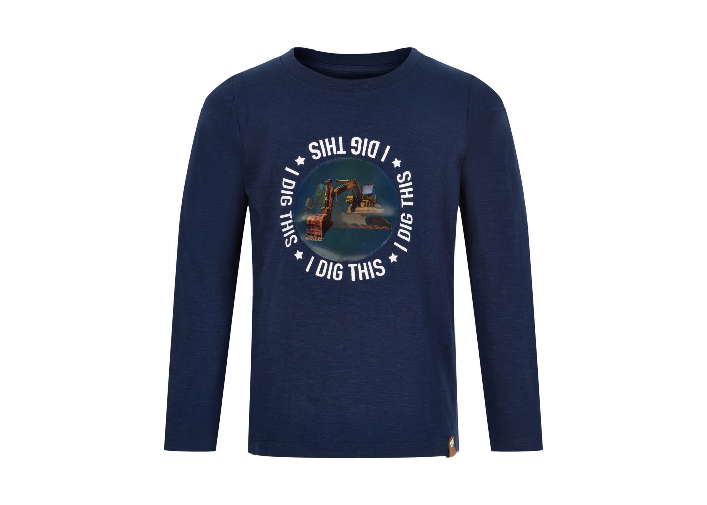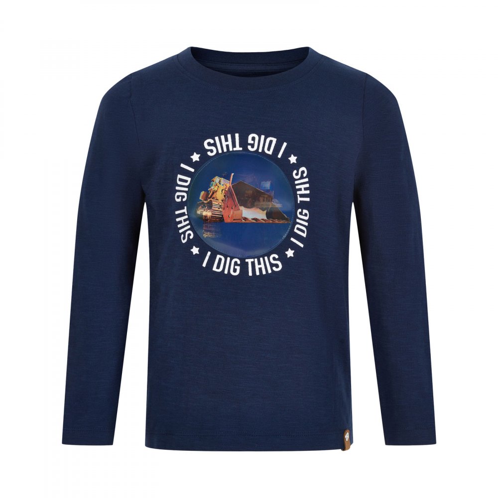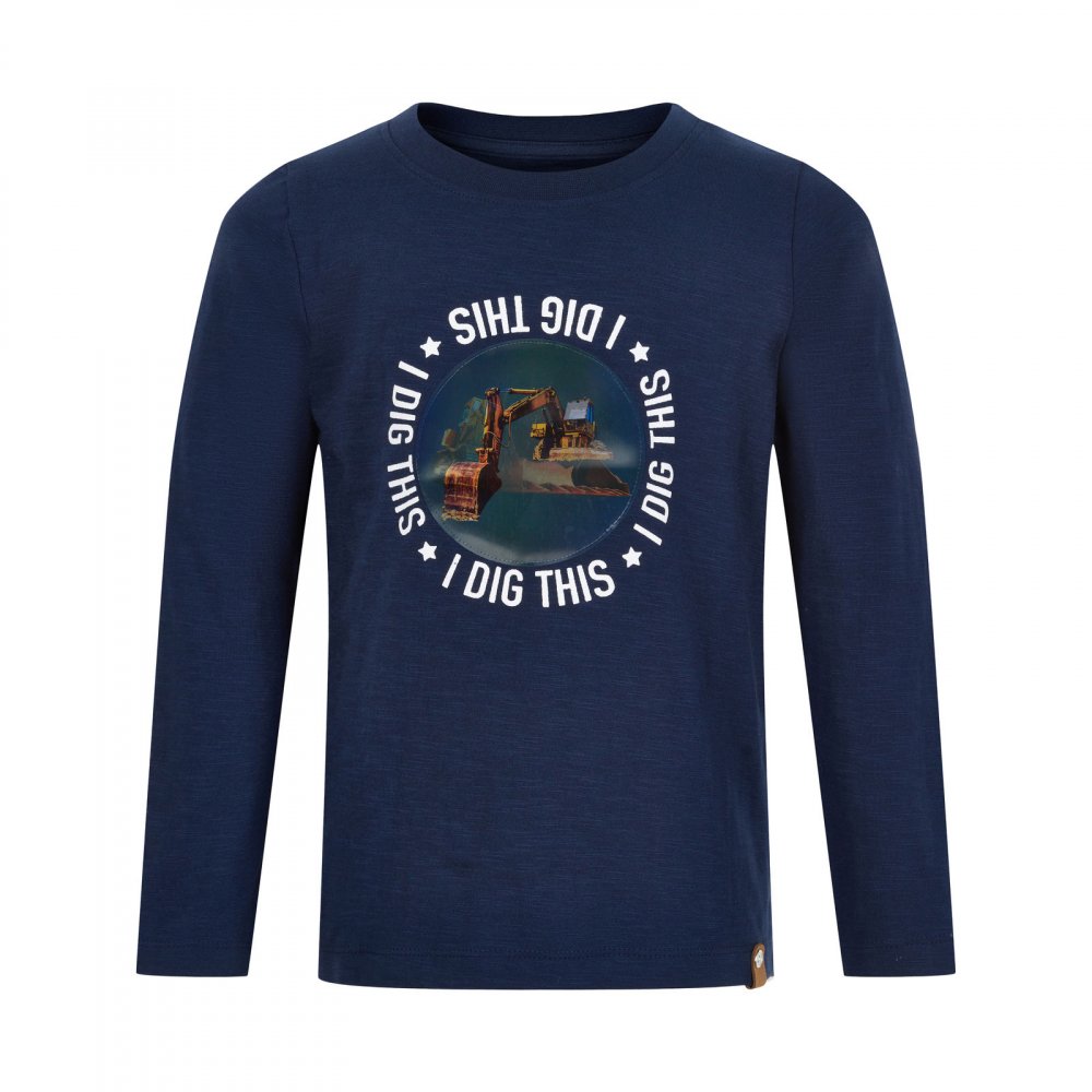 Smart blå t-shirt fra Minymo med gravko print der er omgivet af en cirkel med en tekst i hvid.