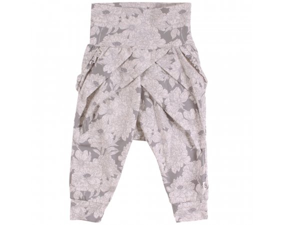 Bukser med flott blomstertrykk og folder foran.Buksen har ribbestrikket kant ved anklene, og en bred ribbestrikket kant i livet, som kan brettes ved behov.
