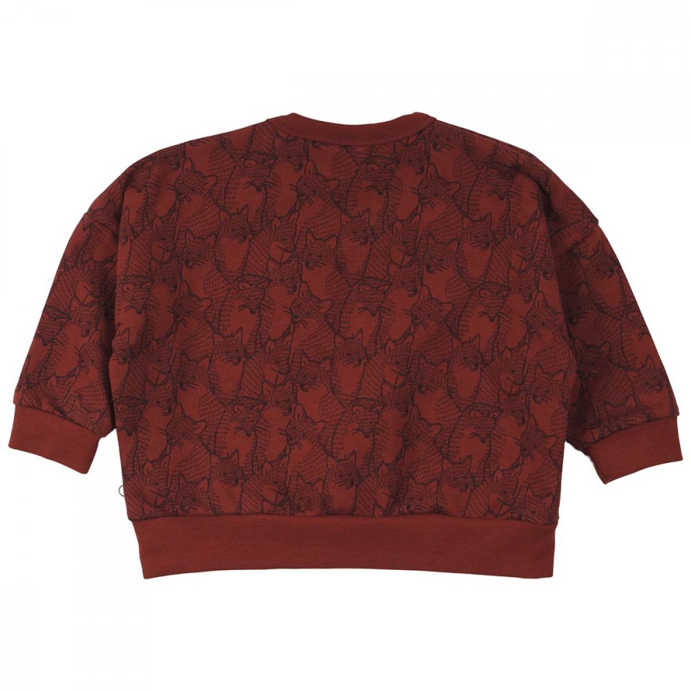 Nydelig langermet genser i rødbrun farge med trykk av søte rev på.Genseren har en børstet innside, som gjør den ekstra myk og behagelig å ha på. Den har en smal ribbekant ved halsen og lukkes med trykknapper på venstre skulder. Genseren har brede, ribbede kanter nederst og ved håndleddene.