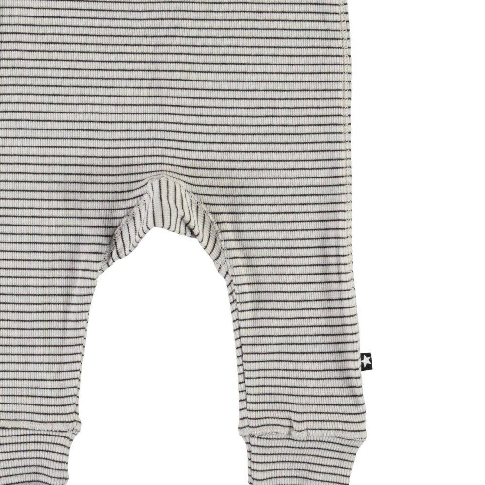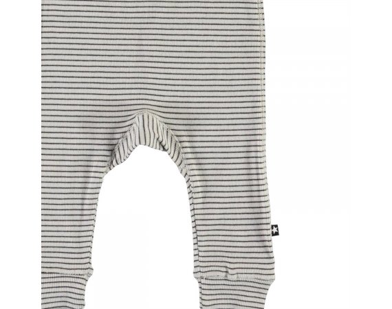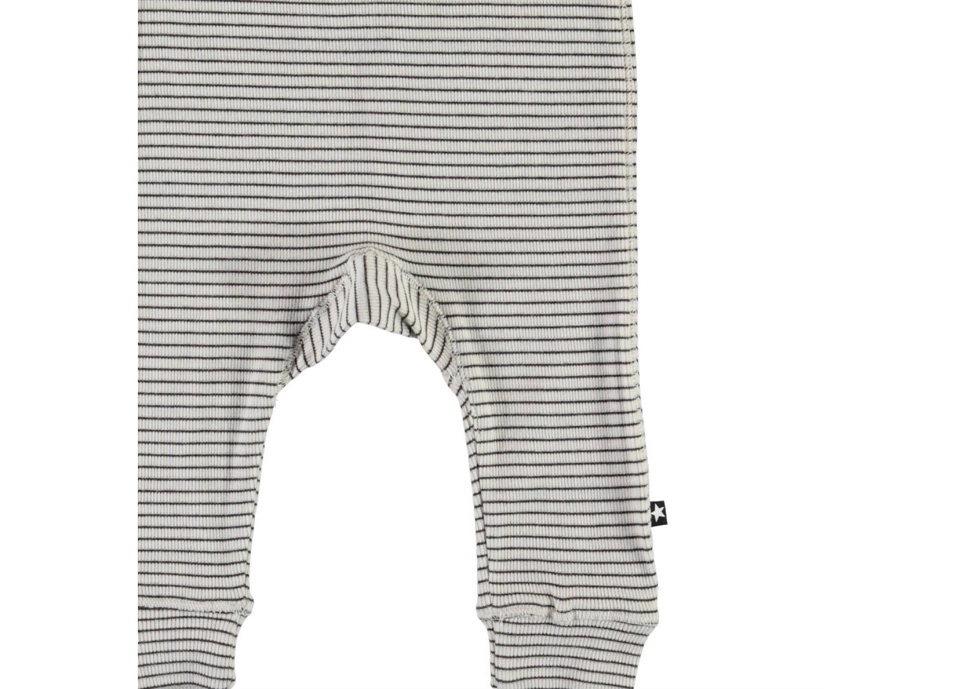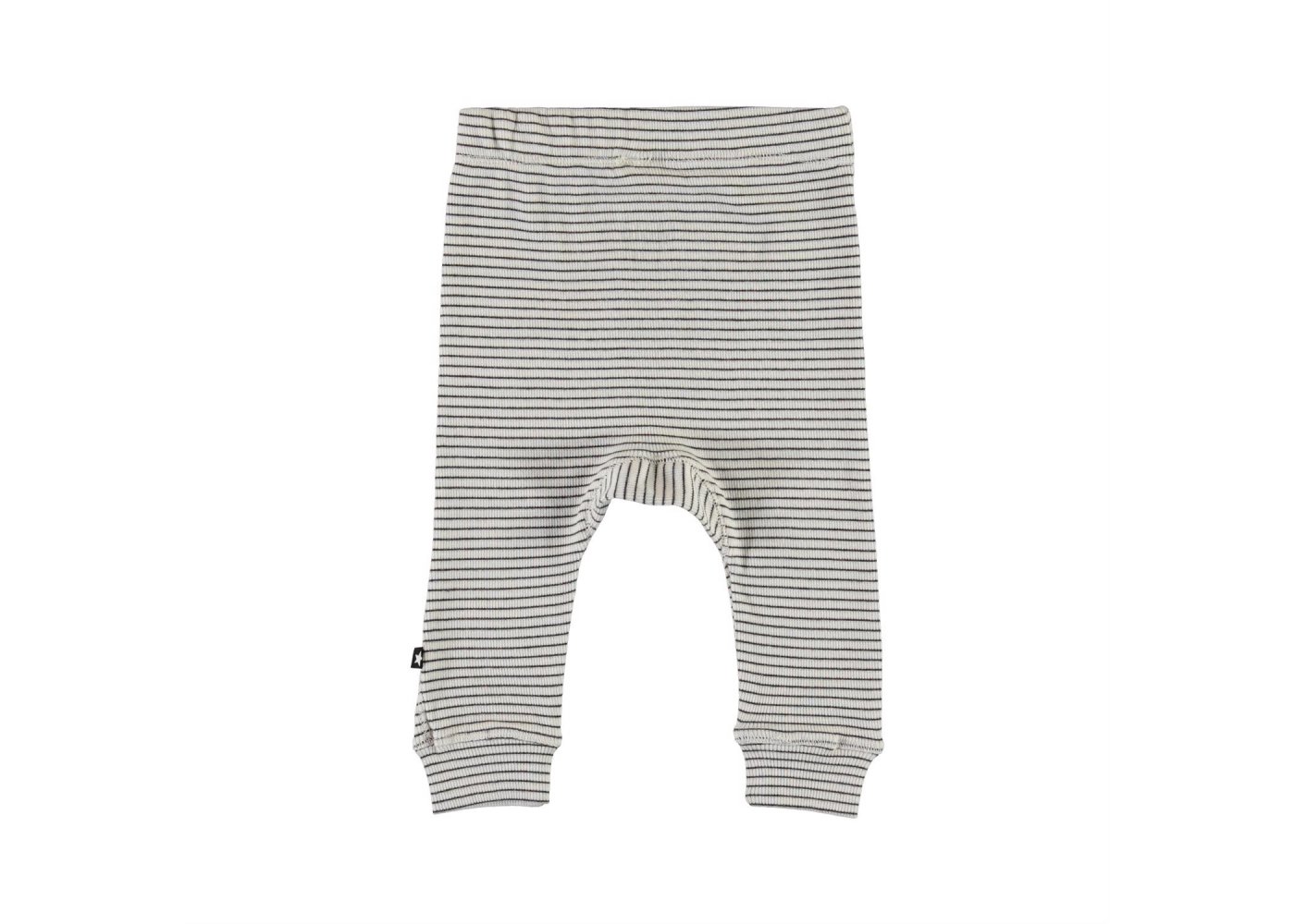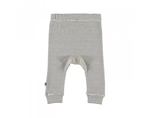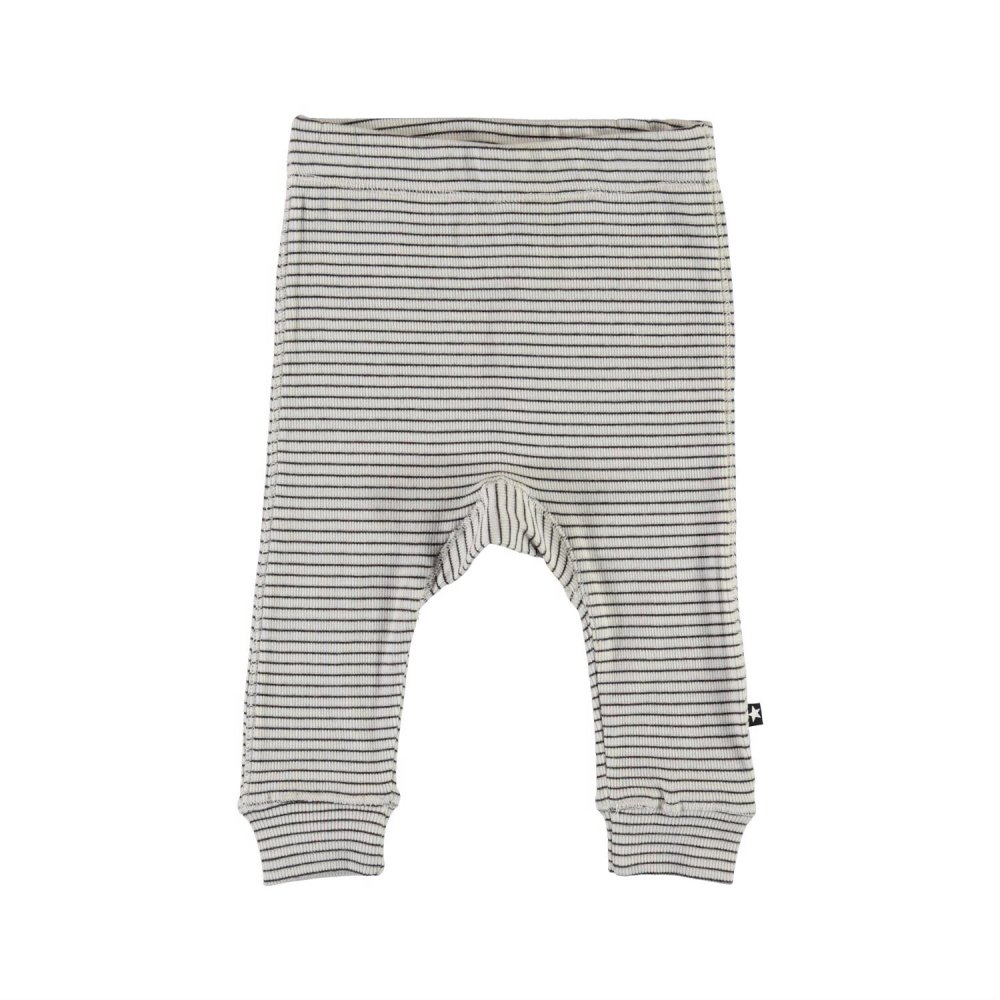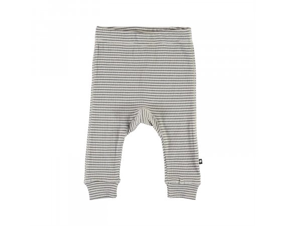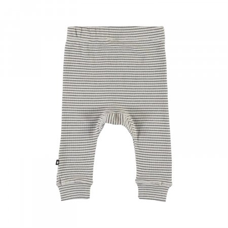 Herlige brun- og hvitstripete babybukserBuksene har smale ben og bred ribbestrikket kant ved anklene.