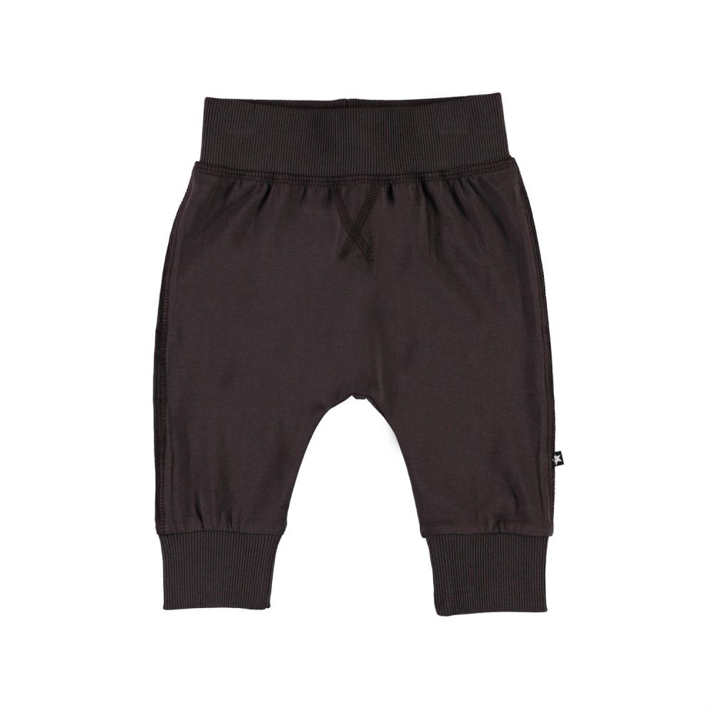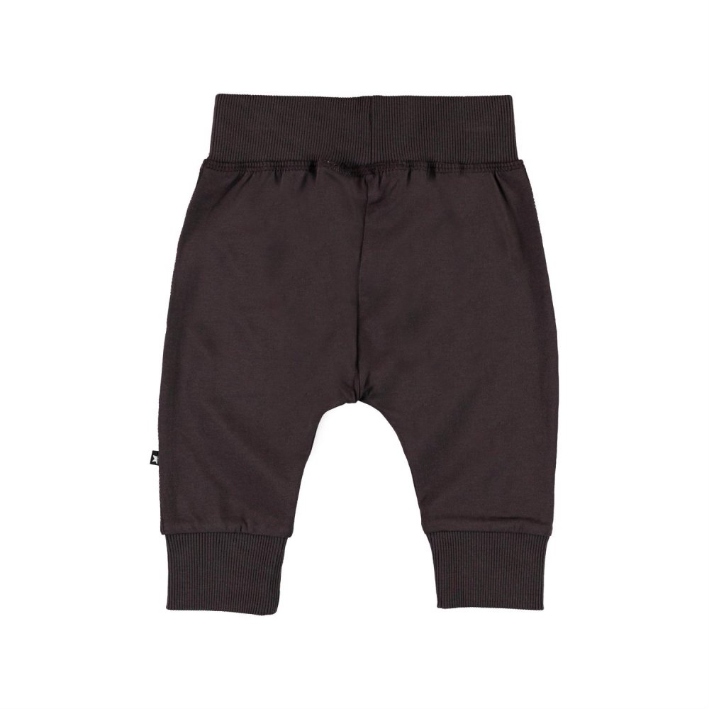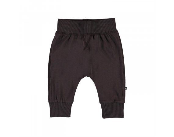 Flotte mørkebrune babybukserBuksene har synlige sømmer foran, som gir buksene et joggebukselignende utseende. Den har en bred ribbestrikket kant ved anklene, og elastikk i livet som skaper en komfortabel passform.