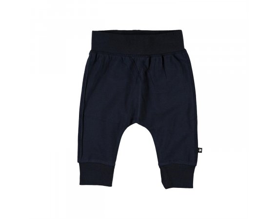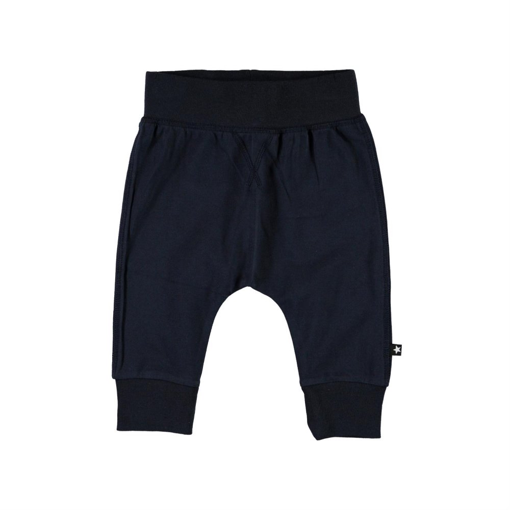 Babybukser med joggebukselignende utseende.Buksene har synlige sømmer foran, en bred elastisk ribbestrikk i livet og ved anklene.