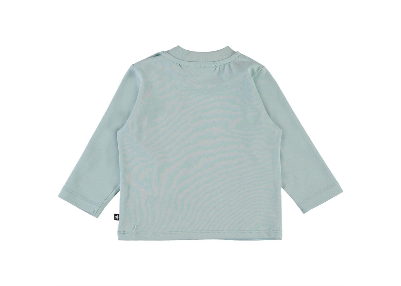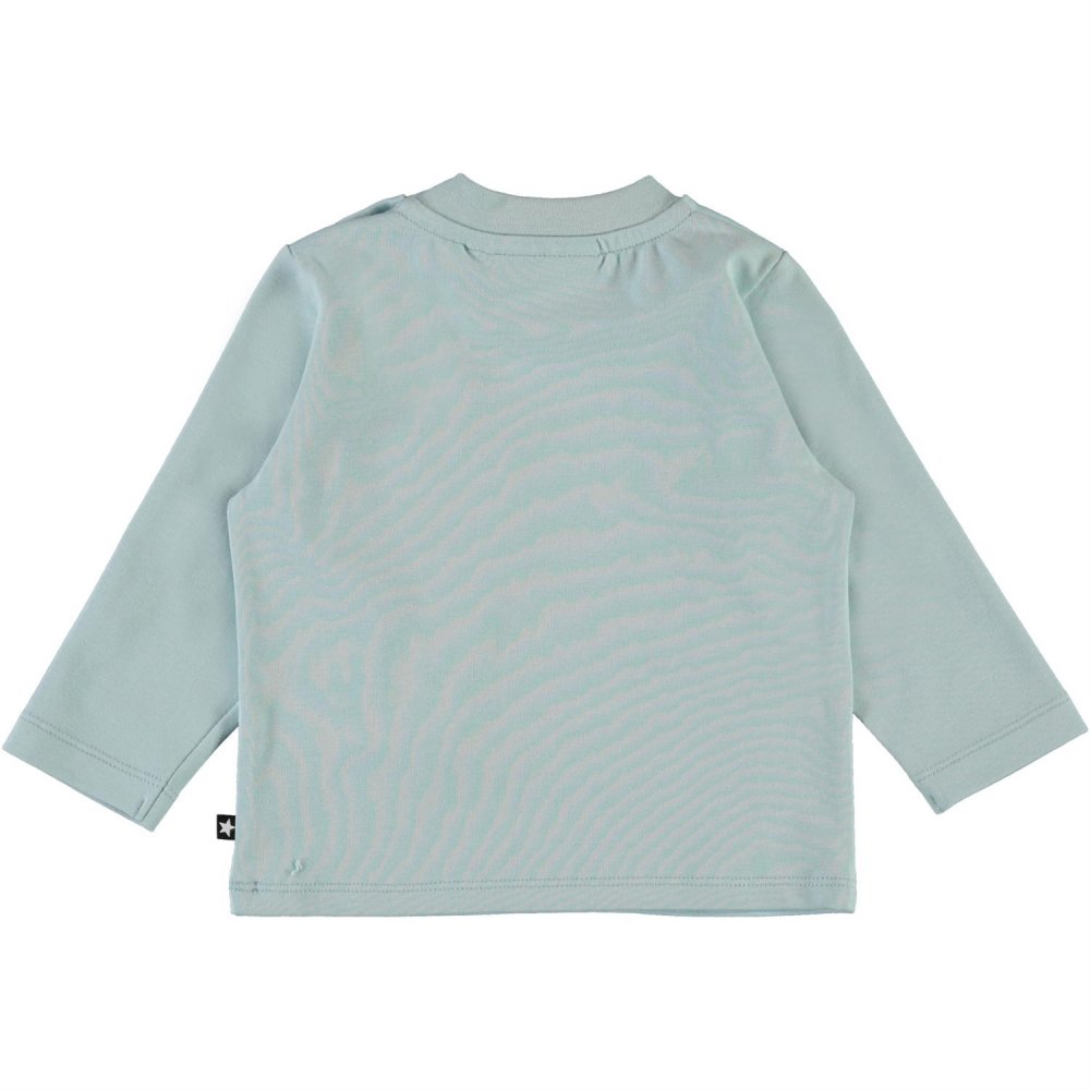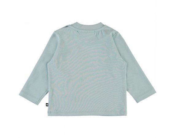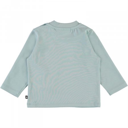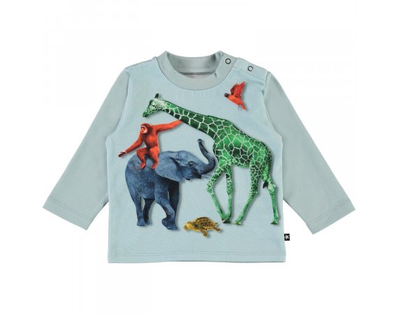 Enovan fra Molo er en bedårende babytrøye i lyseblått med trykk av ulike dyr på forsiden.Trøyen er esnfarget blå bak og lukkes med trykknapper på venstre skulder.