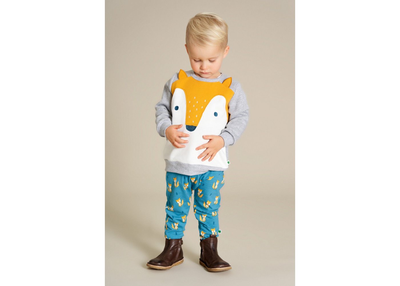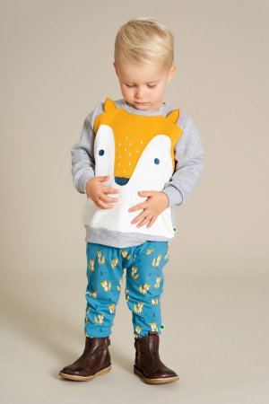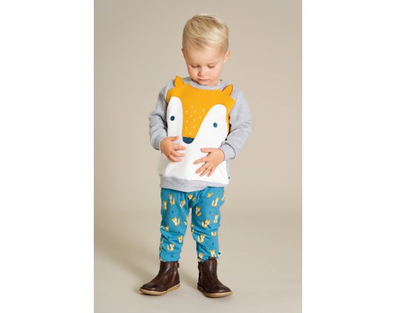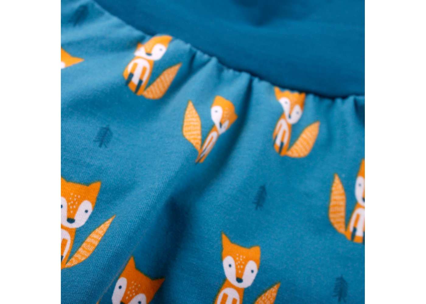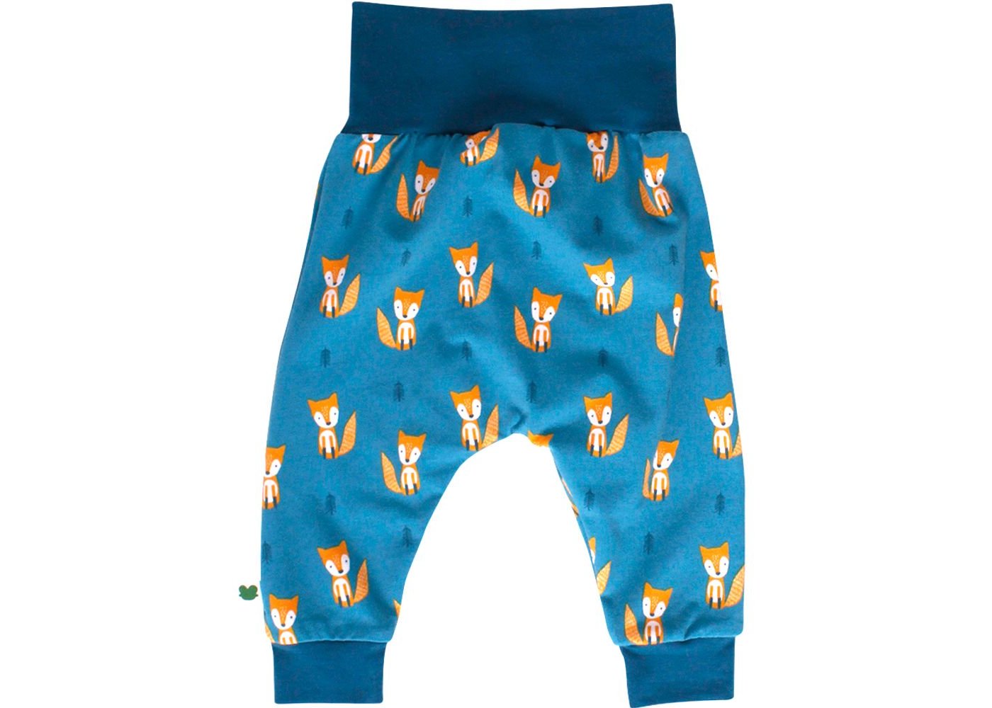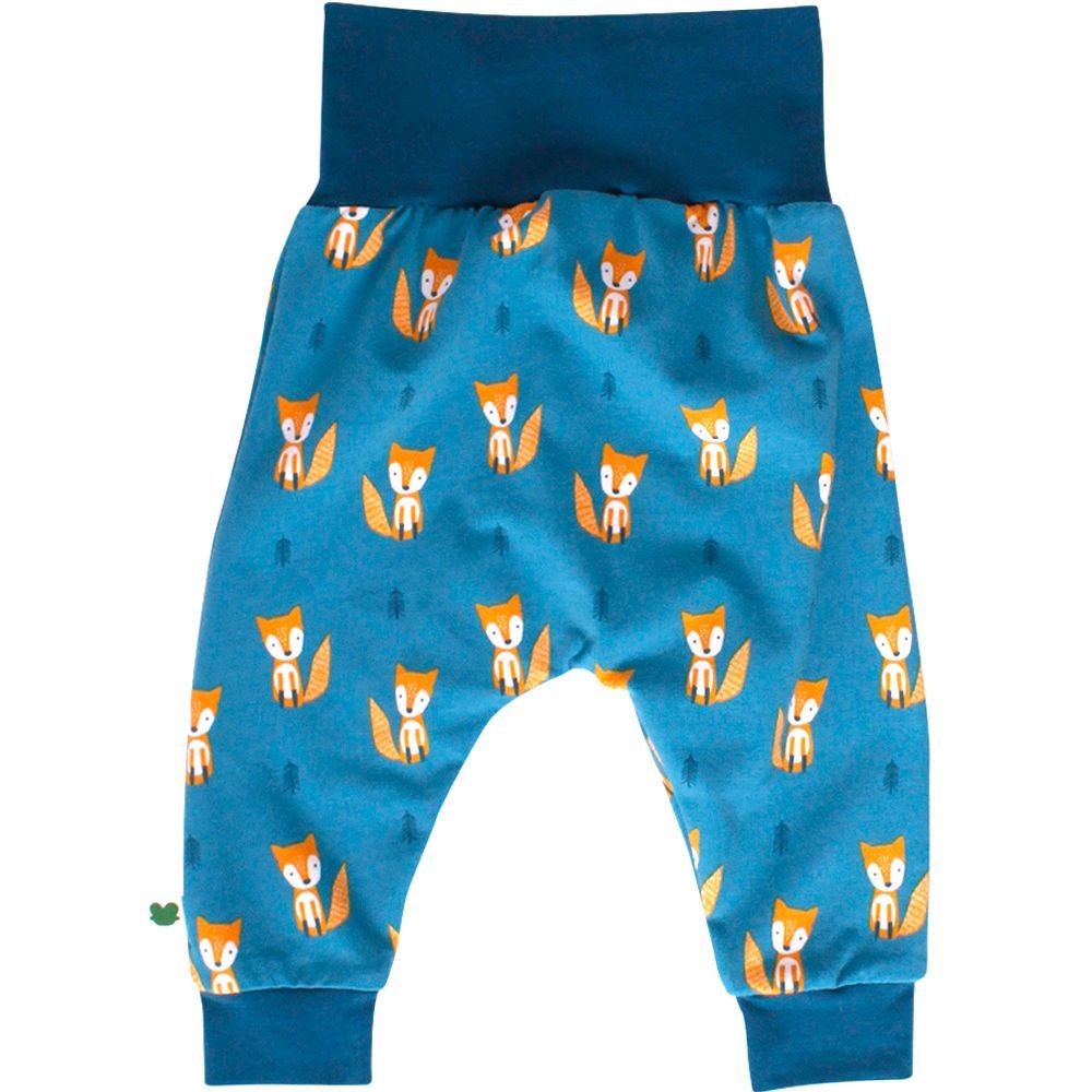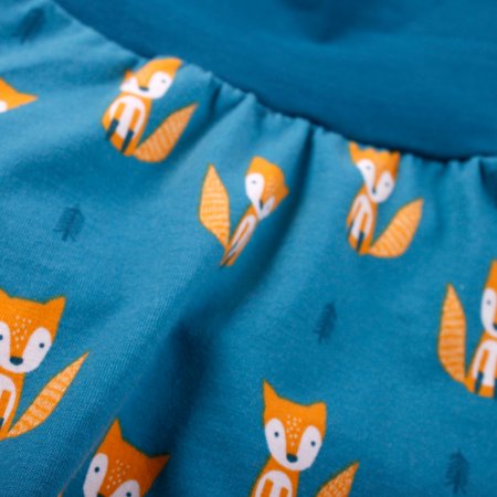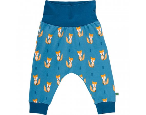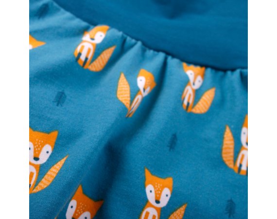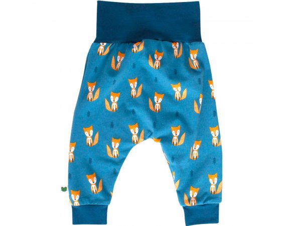 Søte bukser med artig revetrykk.Buksen har en bred kontrastfarget ribbestrikket kant i livet og ved anklene.