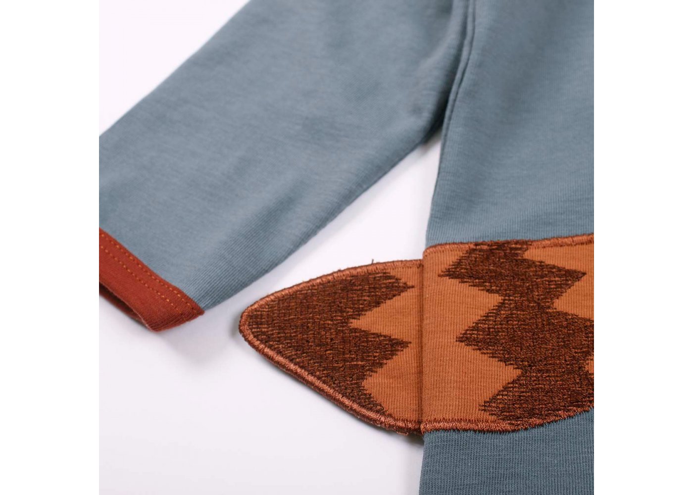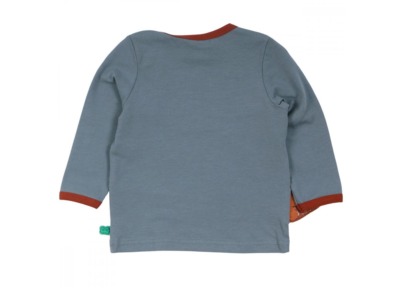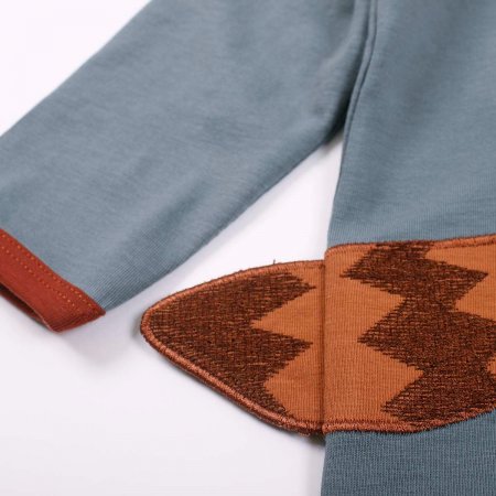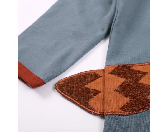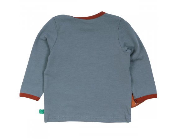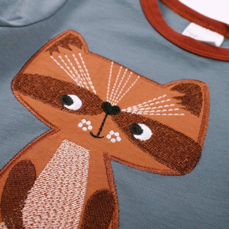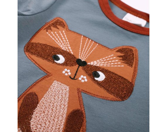 Blusen er i blå og vaskebjørnen i brun. T-shirtens kantbånd er i rustrød.