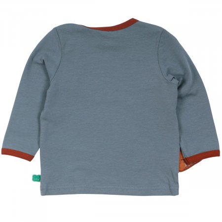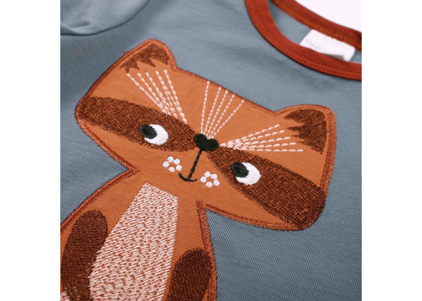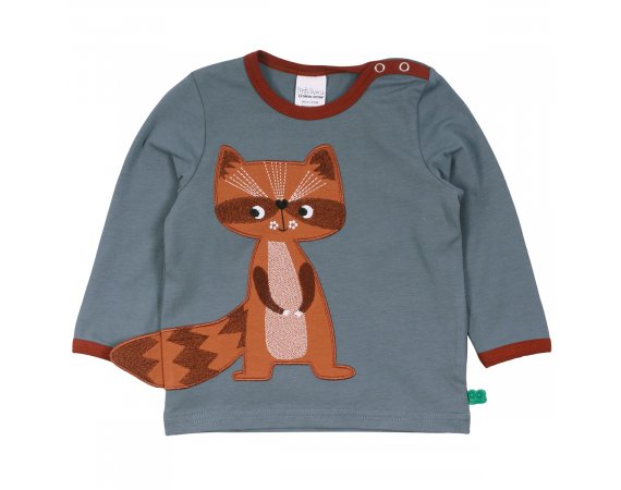Super sød og sjov bluse i blå til de mindste med vaskebjørn applikation.