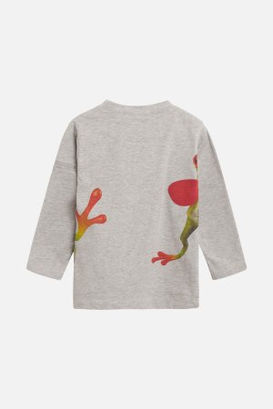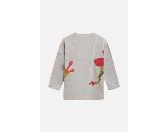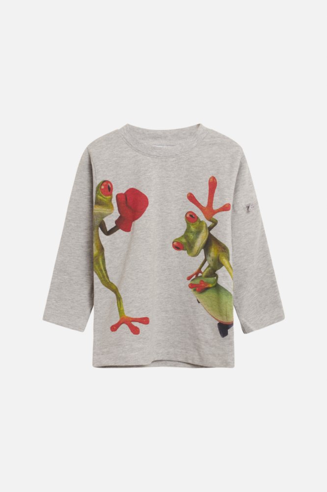 Stilig melert ensfarget T-skjorte dekorert med trykk af frosker i friske fargerStilig T-skjorte med en søt glidelåsdetalj på venstre overarm.