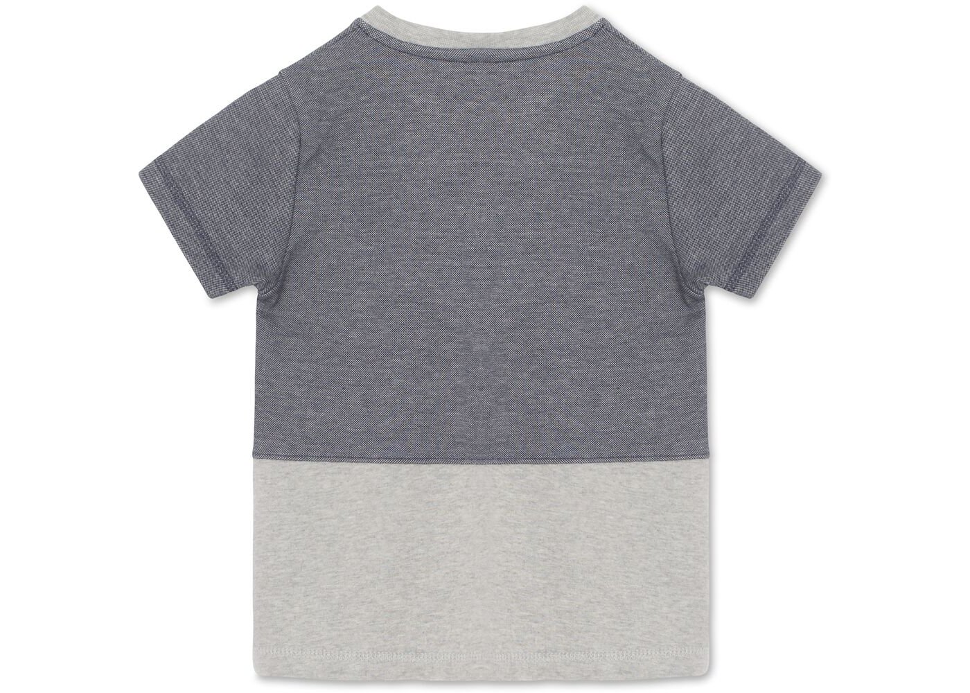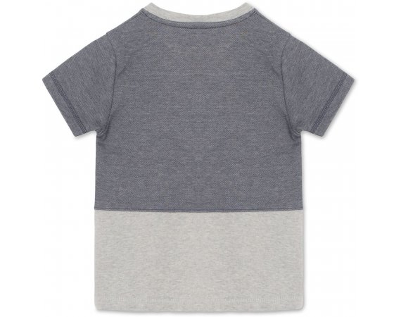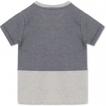 Bunnen af T-skjorten er laget av et tungt jerseymateriale, og den lukkes med trykknapper ved venstre skulder.