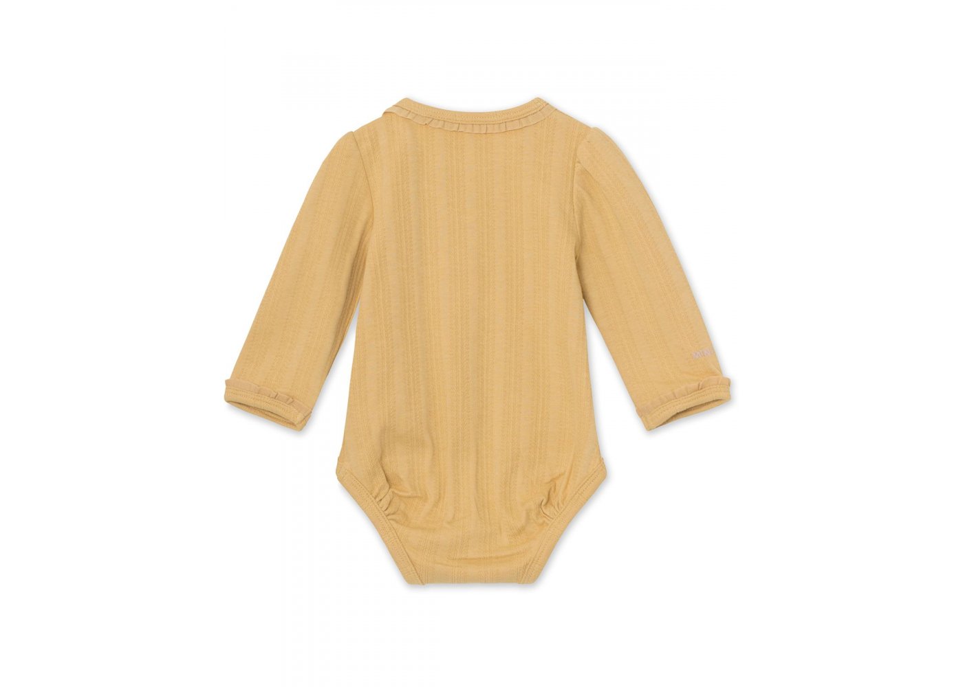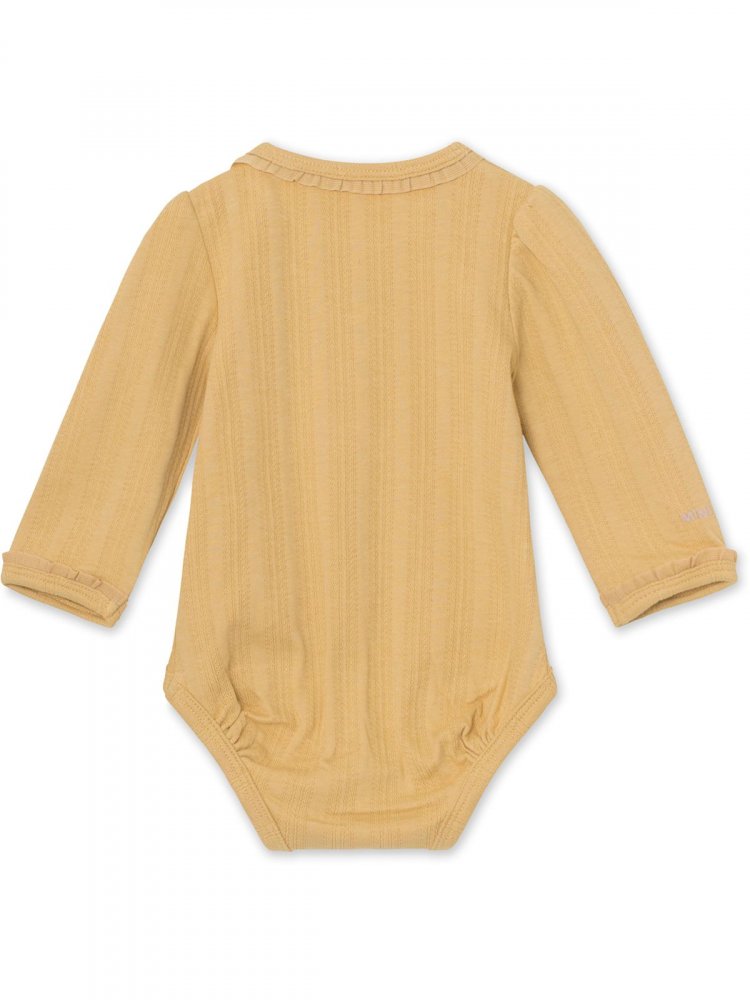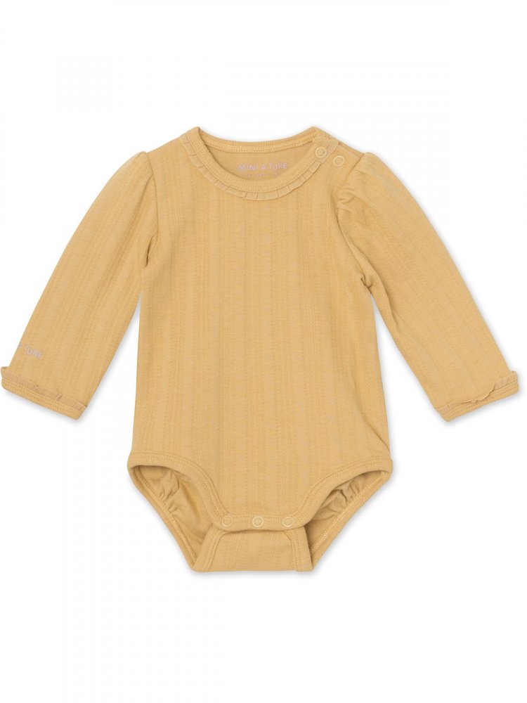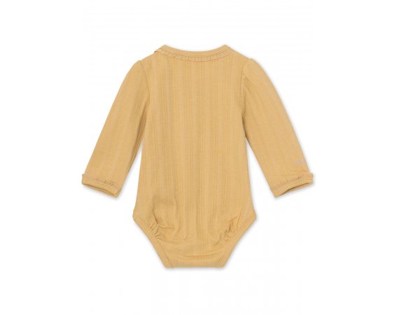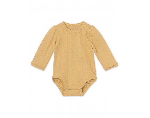 Herlig ensfarget body med strukturmønster og lange ermer.Bodyen har fin tittekant og blonder ved halsen og håndleddene. Den lukkes med trykknapper på venstre skulder og mellom benene.