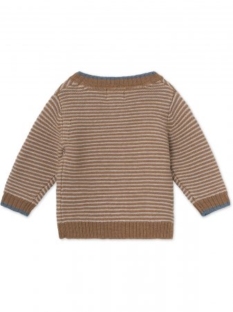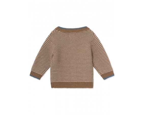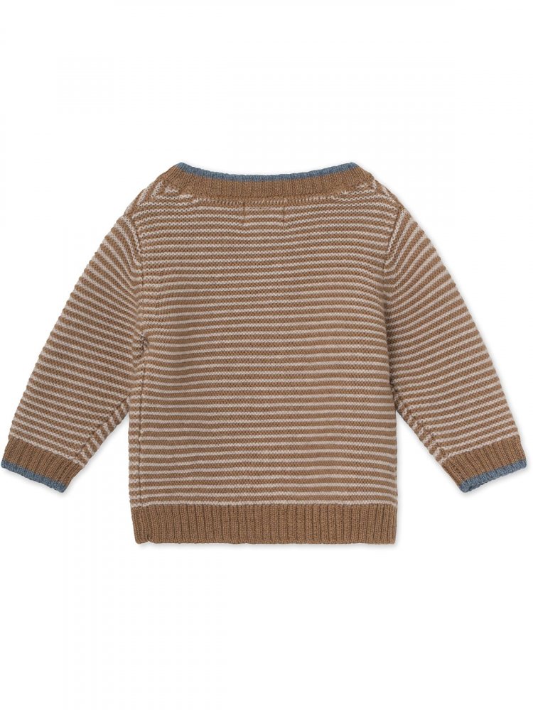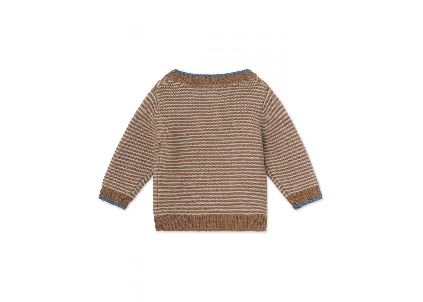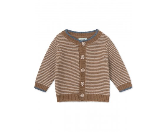 Herlig strikket cardigan av myk merinoull fra Italia. Cardiganen har flotte striper og ribbestrikket kantebånd i brunt, med en sirlig blå kantavslutning ved halsen og håndleddene. Genseren lukkes med knapper foran.Materiale: 100% Baruffa Merinoull