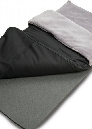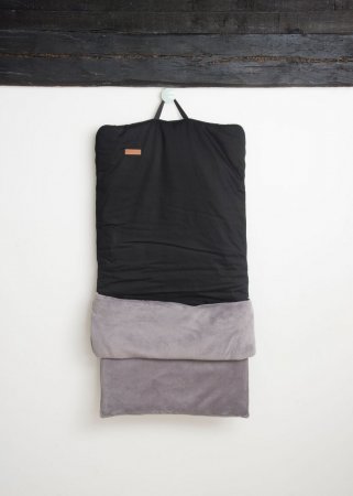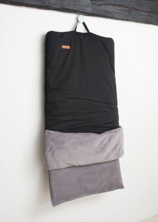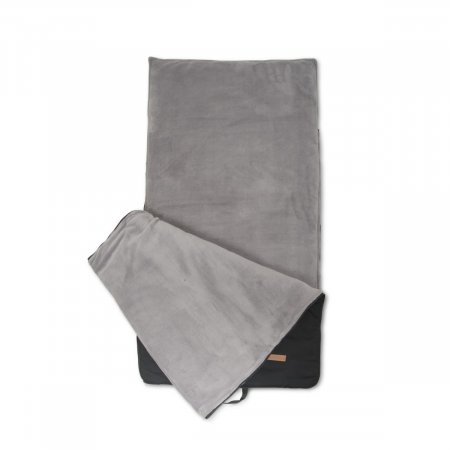 Posen har glidelås på begge sider og kan også brukes som leketeppe når den er helt åpnet opp.