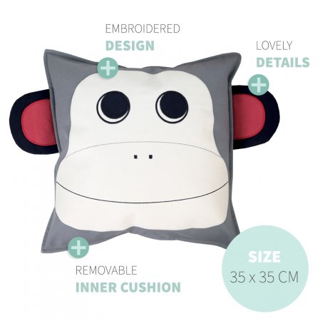 Puten apen Meja er utformet som et dyreansikt med storer ører, som kan dras i. Ørene kan selvfølgelig også brukes til å legge seg inntil, hvis man har bruk for å litte og slappe litt av på sofaen eller i sengen.